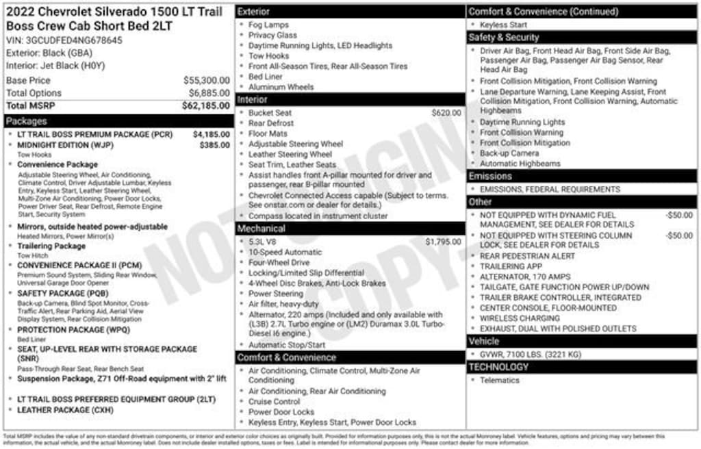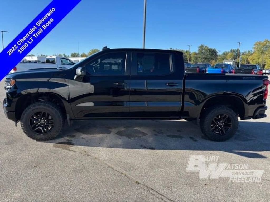 Recent Arrival! CARFAX One-Owner. Odometer is 14124 miles below market average! Priced below KBB Fair Purchase Price!*** WE DELIVER ***Black 2022 Chevrolet Silverado 1500 LT Trail Boss 4D Crew Cab EcoTec3 5.3L V8 10-Speed Automatic 4WDCertified. Chevrolet Certified Pre-Owned Details:* Warranty Deductible: $0* Powertrain Limited Warranty: 72 Month/100,000 Mile (whichever comes first) from original in-service date* 172 Point Inspection* Vehicle History* Transferable Warranty* Limited Warranty: 12 Month/12,000 Mile (whichever comes first) from certified purchase date* 24 months/24,000 miles (whichever comes first) Certified Pre-Owned Scheduled Maintenance Plan and 3 days/150 miles (whichever comes first) Vehicle Exchange Program. SiriusXM 3-month trial subscription.* Roadside Assistance10-Way Power Driver Seat w/Lumbar, 12.3 Multicolor Reconfigurable Digital Display, 120-Volt Bed Mounted Power Outlet, 120-Volt Instrument Panel Power Outlet, 170 Amp Alternator, 2 USB Data Ports, 220 Amp Alternator, 4-Wheel Disc Brakes, 40/20/40 Front Split-Bench Seat, 6 Speakers, 6-Speaker Audio System, ABS brakes, Air Conditioning, All-Weather Floor Liner (LPO) (AAK), Alloy wheels, AM/FM radio: SiriusXM with 360L, Apple CarPlay/Android Auto, Auto High-beam Headlights, Auto-Locking Rear Differential, Automatic Emergency Braking, Automatic temperature control, Auxiliary External Transmission Oil Cooler, Bluetooth® For Phone, Brake assist, Chevrolet Connected Access Capable, Chevytec Spray-On Black Bedliner, Cloth Seat Trim, Color-Keyed Carpeting Floor Covering, Compass, Convenience Package, Convenience Package II, Deep-Tinted Glass, Delay-off headlights, Driver door bin, Driver vanity mirror, Dual Exhaust w/Polished Outlets, Dual front impact airbags, Dual front side impact airbags, Dual Rear USB Ports (Charge Only), Dual-Zone Automatic Climate Control, Electric Rear-Window Defogger, Electrical Steering Column Lock, Electronic Cruise Control, Electronic Stability Control, Electronic Transmission Range Selector Shifter, External Engine Oil Cooler, EZ Lift Power Lock & Release Tailgate, Floor Mounted Center Console, Following Distance Indicator, Forward Collision Alert, Front anti-roll bar, Front Bucket Seats, Front Center Armrest w/Storage, Front dual zone A/C, Front fog lights, Front Frame-Mounted Black Recovery Hooks, Front LED Fog Lamps, Front Pedestrian Braking, Front reading lights, Front wheel independent suspension, Fully automatic headlights, HD Rear Vision Camera, HD Surround Vision, Heated door mirrors, Heated Driver & Front Outboard Passenger Seats, Heated front seats, Heated Power-Adjustable Outside Mirrors, Heated Steering Wheel, Heated steering wheel, Heavy-Duty Air Filter, High Gloss Black Mirror Caps, Hill Descent Control, Hitch Guidance, Hitch Guidance w/Hitch View, Illuminated entry, Inside Rear-View Mirror w/Tilt, Integrated Trailer Brake Controller, IntelliBeam Automatic High Beam On/Off, Keyless Open & Start, Lane Keep Assist w/Lane Departure Warning, Leather Package, Leather Wrapped Steering Wheel, Leather-Appointed Front Seat Trim, LED Cargo Area Lighting, Low tire pressure warning, LT Trail Boss Premium Package, Manual Tilt/Telescoping Steering Column, Midnight Edition, Not Equipped w/Dynamic Fuel Management, Not Equipped w/Steering Column Lock, Occupant sensing airbag, OnStar & Chevrolet Connected Services Capable, Outside temperature display, Overhead airbag, Overhead console, Panic alarm, Passenger door bin, Passenger vanity mirror, Performance Red Recovery Hooks, Perimeter Lighting, Power door mirrors, Power driver seat, Power Front Windows w/Driver Express Up/Down, Power Front Windows w/Passenger Express Down, Power Rear Windows w/Express Down, Power Sliding Rear Window w/Rear Defogger, Power steering, Power Tailgate, Power windows, Preferred Equipment Group 2LT, Premium audio system: Chevrolet Infotainment 3 Premium, Premium Bose 7