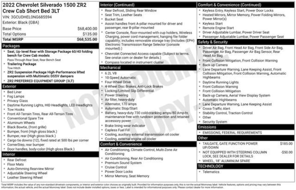 Local Trade, Non Smoker, One Owner, 172 point inspection certified, 1st oil change free with purchase, 2 Key Fobs, 10-Way Power Driver Seat w/Lumbar, 10-Way Power Passenger Seat Adjuster w/Lumbar, 12.3 Multicolor Reconfigurable Digital Display, 120-Volt Bed Mounted Power Outlet, 120-Volt Instrument Panel Power Outlet, 170 Amp Alternator, 2 USB Data Ports, 2nd Row Heated Outboard Seats, 3.23 Rear Axle Ratio, 4-Wheel Disc Brakes, 7 Speakers, ABS brakes, Air Conditioning, All-Weather Floor Liner (LPO), Alloy wheels, AM/FM radio: SiriusXM with 360L, Apple CarPlay/Android Auto, Auto High-beam Headlights, Auto-dimming door mirrors, Auto-Dimming Inside Rear-View Mirror, Auto-dimming Rear-View mirror, Auto-Locking Rear Differential, Automatic Emergency Braking, Automatic temperature control, Bed View Camera, Bluetooth® For Phone, Brake assist, Chevrolet Connected Access Capable, Chevytec Spray-On Black Bedliner, Color-Keyed Carpeting Floor Covering, Compass, Deep-Tinted Glass, Delay-off headlights, Driver door bin, Driver Memory, Driver vanity mirror, Dual Exhaust, Dual front impact airbags, Dual front side impact airbags, Dual Rear USB Ports (Charge Only), Electric Rear-Window Defogger, Electrical Steering Column Lock, Electronic Cruise Control, Electronic Stability Control, Electronic Transmission Range Selector Shifter, EZ Lift Power Lock & Release Tailgate, Floor Mounted Center Console, Following Distance Indicator, Forward Collision Alert, Front anti-roll bar, Front Bucket Seats, Front Center Armrest, Front dual zone A/C, Front fog lights, Front LED Fog Lamps, Front Pedestrian Braking, Front Rainsensing Wipers, Front reading lights, Front wheel independent suspension, Fully automatic headlights, Garage door transmitter, HD Surround Vision, Heated door mirrors, Heated Driver & Front Outboard Passenger Seats, Heated front seats, Heated rear seats, Heated Steering Wheel, Heated steering wheel, Heavy-Duty Air Filter, High Gloss Black Mirror Caps, Hill Descent Control, Hitch Guidance, Hitch Guidance w/Hitch View, Illuminated entry, Integrated Trailer Brake Controller, IntelliBeam Automatic High Beam On/Off, Keyless Open & Start, Lane Keep Assist w/Lane Departure Warning, Leather Wrapped Steering Wheel, LED Cargo Area Lighting, Low tire pressure warning, Manual Tilt/Telescoping Steering Column, Memory seat, Not Equipped w/Steering Column Lock, Occupant sensing airbag, OnStar & Chevrolet Connected Services Capable, Outside Heated Power-Adjustable Mirrors, Outside temperature display, Overhead airbag, Overhead console, Panic alarm, Passenger door bin, Passenger vanity mirror, Perforated Leather Seat Trim, Performance Red Recovery Hooks, Perimeter Lighting, Power door mirrors, Power driver seat, Power Front Passenger Windows w/Express Up/Down, Power Front Windows w/Driver Express Up/Down, Power passenger seat, Power Rear Windows w/Express Down, Power Sliding Rear Window w/Rear Defogger, Power steering, Power Tailgate, Power windows, Preferred Equipment Group 3LT, Premium audio system: Chevrolet Infotainment 3 Premium, Premium Bose 7-Speaker Sound System, Radio data system, Radio: Chevrolet Infotainment 3 Premium System, Rain sensing wipers, Rear Cross Traffic Alert-Braking, Rear Park Assist, Rear Pedestrian Detection, Rear reading lights, Rear seat center armrest, Rear step bumper, Rear Wheelhouse Liners, Rear window defroster, Remote keyless entry, Remote Vehicle Starter System, Safety Alert Seat, Security system, SiriusXM w/360L, Speed control, Speed-sensing steering, Split folding rear seat, Standard Tailgate, Steering Wheel Audio Controls, Steering wheel mounted audio controls, Tachometer, Telescoping steering wheel, Theft Deterrent System (Unauthorized Entry), Tilt steeri
