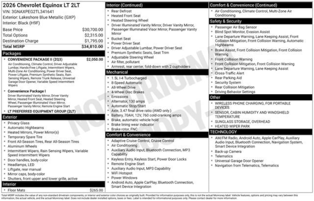 Recent Arrival! Factory MSRP: $34,810 $2,577 off MSRP!*** WE DELIVER ***Blue 2026 Chevrolet Equinox LT 4D Sport Utility AWD 1.5L DOHC 8-Speed Automatic2-Way Power Driver Lumbar Control Seat Adjuster, 4-Wheel Disc Brakes, 6 Speakers, ABS brakes, Air Conditioning, AM/FM radio: SiriusXM, Auto High-beam Headlights, AutoSense Hands-Free Power Programmable Liftgate, Brake assist, Cabin Humidity & Windshield Sensor, Compass, Convenience Package II, Driver 8-Way Power Seat Adjuster, Dual front impact airbags, Dual front side impact airbags, Dual-Zone Automatic Climate Control, Electronic Stability Control, Emergency communication system: OnStar and Chevrolet connected services capable, Evotex Seat Trim, Fully automatic headlights, Heated door mirrors, Heated Driver & Front Passenger Seats, Heated steering wheel, Heated Wiper Park, Illuminated entry, Intermittent Front Rain-Sensing Wipers, Low tire pressure warning, Occupant sensing airbag, Outside temperature display, Overhead airbag, Overhead Sunglass Storage, Power door mirrors, Preferred Equipment Group 2LT, Premium audio system: Chevrolet Infotainment 3, Programmable Universal Home Remote, Radio data system, Radio: 11.3 Diagonal Advanced Color LCD Display, Rear window defroster, Rear window wiper, Remote keyless entry, Security system, SiriusXM w/360L Trial Subscription, Speed control, Split folding rear seat, Steering wheel mounted audio controls, Telescoping steering wheel, Tilt steering wheel, Traction control, Variably intermittent wipers, Wheels: 17 Grazen Metallic Machined-Face Aluminum, Wireless Phone Charging for Portable Devices, 3.47 Final Drive Axle Ratio, Alloy wheels, Bumpers: body-color, Cloth Seat Trim, Delay-off headlights, Driver 6-Way Manual Seat Adjuster, Driver door bin, Driver vanity mirror, Four wheel independent suspension, Front anti-roll bar, Front Bucket Seats, Front Center Armrest, Front Passenger 4-Way Manual Seat Adjuster, Front reading lights, Heated front seats, Navigation System, Overhead console, Panic alarm, Passenger door bin, Passenger vanity mirror, Power steering, Power windows, Rear anti-roll bar, Rear reading lights, Rear seat center armrest, Speed-sensing steering, Spoiler, Tachometer, Trip computer, 2-Way Power Driver Lumbar Control Seat Adjuster, 4-Wheel Disc Brakes, 6 Speakers, ABS brakes, Air Conditioning, AM/FM radio: SiriusXM, Auto High-beam Headlights, AutoSense Hands-Free Power Programmable Liftgate, Brake assist, Cabin Humidity & Windshield Sensor, Compass, Convenience Package II, Driver 8-Way Power Seat Adjuster, Dual front impact airbags, Dual front side impact airbags, Dual-Zone Automatic Climate Control, Electronic Stability Control, Emergency communication system: OnStar and Chevrolet connected services capable, Evotex Seat Trim, Fully automatic headlights, Heated door mirrors, Heated Driver & Front Passenger Seats, Heated steering wheel, Heated Wiper Park, Illuminated entry, Intermittent Front Rain-Sensing Wipers, Low tire pressure warning, Occupant sensing airbag, Outside temperature display, Overhead airbag, Overhead Sunglass Storage, Power door mirrors, Preferred Equipment Group 2LT, Premium audio system: Chevrolet Infotainment 3, Programmable Universal Home Remote, Radio data system, Radio: 11.3 Diagonal Advanced Color LCD Display, Rear window defroster, Rear window wiper, Remote keyless entry, Security system, SiriusXM w/360L Trial Subscription, Speed control, Split folding rear seat, Steering wheel mounted audio controls, Telescoping steering wheel, Tilt steering wheel, Traction control, Variably intermittent wipers, Wheels: 17 Grazen Metallic Machined-Face Aluminum, Wireless Phone Charging for Portable Devices.