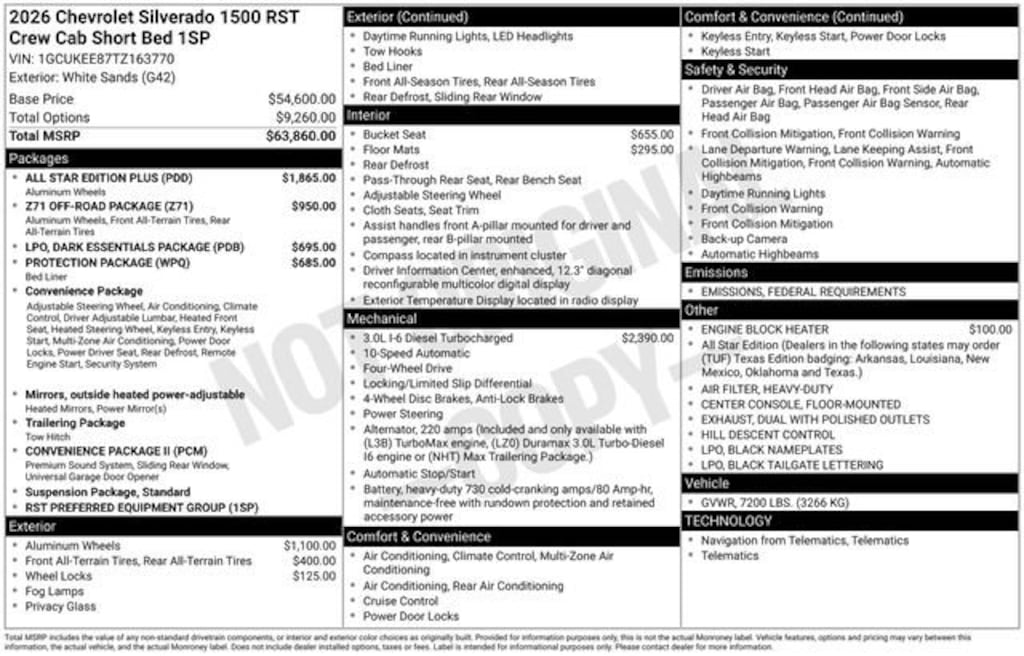 10-Way Power Driver Seat w/Lumbar, 12.3 Multicolor Reconfigurable Digital Display, 120-Volt Bed Mounted Power Outlet, 120-Volt Interior Power Outlet, 2 USB Data Ports, 3.23 Rear Axle Ratio, 4-Wheel Disc Brakes, 6-Speaker Audio System, ABS brakes, Air Conditioning, All Star Edition Plus, All-Star Edition, All-Weather Floor Liner (LPO) (AAK), AM/FM radio: SiriusXM with 360L, Apple CarPlay/Android Auto, Auto High-beam Headlights, Auto-Locking Rear Differential, Automatic Emergency Braking, Automatic temperature control, Black Name Plates (LPO), Black Tailgate CHEVROLET Lettering (LPO), Bluetooth® For Phone, Brake assist, Chevytec Spray-On Black Bedliner, Color-Keyed Carpeting Floor Covering, Compass, Convenience Package, Convenience Package II, Dark Essentials Package (LPO), Deep-Tinted Glass, Dual Exhaust w/Polished Outlets, Dual front impact airbags, Dual front side impact airbags, Dual Rear USB Ports (Charge Only), Dual-Zone Automatic Climate Control, Electric Rear-Window Defogger, Electronic Cruise Control, Electronic Stability Control, Electronic Transmission Range Selector Shifter, Emergency communication system: OnStar, EZ Lift Power Lock & Release Tailgate, Floor Mounted Center Console, Following Distance Indicator, Forward Collision Alert, Front Bucket Seats, Front dual zone A/C, Front fog lights, Front Frame-Mounted Black Recovery Hooks, Front LED Fog Lamps, Front Pedestrian Braking, Front Rubberized Vinyl Floor Mats, Fully automatic headlights, HD Rear Vision Camera, Heated door mirrors, Heated Driver & Front Outboard Passenger Seats, Heated Power-Adjustable Outside Mirrors, Heated Steering Wheel, Heavy-Duty Air Filter, High Capacity Suspension Package, High Gloss Black Mirror Caps, Hill Descent Control, Hitch Guidance, Hitch Guidance w/Hitch View, Illuminated entry, In-Vehicle Trailering System App, Inside Rear-View Mirror w/Tilt, Integrated Trailer Brake Controller, IntelliBeam Automatic High Beam On/Off, Keyless Open & Start, Lane Keep Assist w/Lane Departure Warning, LED Cargo Area Lighting, Low tire pressure warning, Manual Tilt/Telescoping Steering Column, Occupant sensing airbag, Off-Road Suspension, OnStar Services Capable, Outside temperature display, Overhead airbag, Power door mirrors, Power driver seat, Power Front Windows w/Driver Express Up/Down, Power Front Windows w/Passenger Express Down, Power Rear Windows w/Express Down, Power Sliding Rear Window w/Rear Defogger, Preferred Equipment Group 1SP, Premium audio system: Chevrolet Infotainment 3 Premium, Premium Bose 7-Speaker Sound System, Protection Package, Radio data system, Radio: Chevrolet Infotainment 3 Premium System, Rear 60/40 Folding Bench Seat (Folds Up), Rear Rubberized-Vinyl Floor Mats, Rear Wheelhouse Liners, Remote keyless entry, Remote Vehicle Starter System, SiriusXM w/360L Trial Subscription, Standard Tailgate, Steering Wheel Audio Controls, Steering wheel mounted audio controls, Teen Driver, Telescoping steering wheel, Theft Deterrent System (Unauthorized Entry), Tilt steering wheel, Tire Pressure Monitoring System, Traction control, Trailering Package, Universal Home Remote, Variably intermittent wipers, Wheel Locks (Set of 4) (LPO), Wheels: 20 x 9 High Gloss Black Painted Alum, Wi-Fi Hot Spot Capable, Wireless Charging, Wrapped Steering Wheel, Z71 Off-Road Package, 220 Amp Alternator, 6 Speakers, Alloy wheels, Bumpers: body-color, Cloth Seat Trim, Delay-off headlights, Driver door bin, Driver vanity mirror, Engine Block Heater, Front anti-roll bar, Front Center Armrest w/Storage, Front reading lights, Front wheel independent suspension, Heated front seats, Heated steering wheel, Overhead console, Panic alarm, Passenger door bi Rebates listed are for zip code 48623. Must qualify for GMS Employee purchase plan$1000 - Bonus