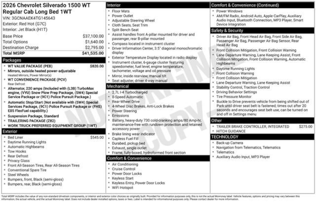 Red Hot 2026 Chevrolet Silverado 1500 WT 2D Standard Cab RWD 2.7L I4 Turbocharged DOHC 16V LEV3-SULEV30 310hp 8-Speed Automatic