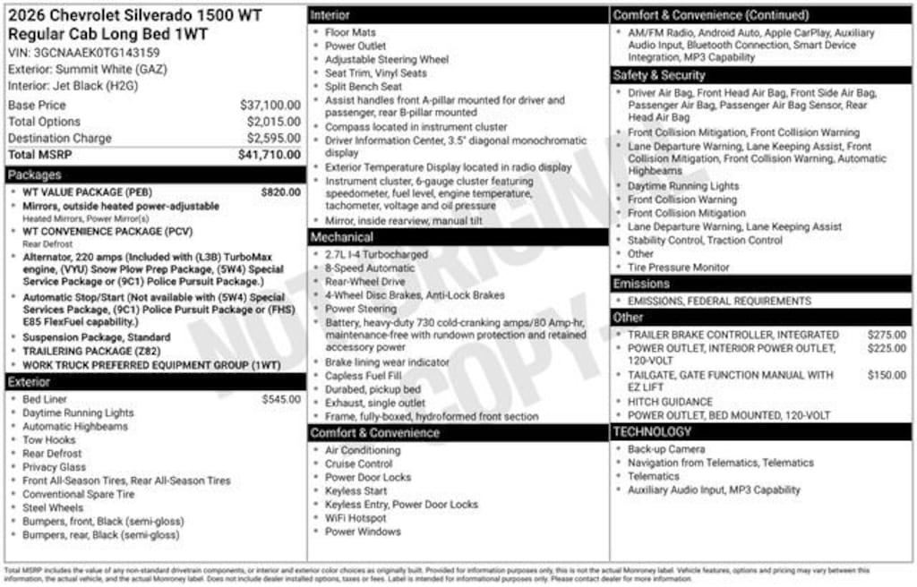 120-Volt Bed Mounted Power Outlet, 120-Volt Interior Power Outlet, 2-Speaker Audio System, 3.42 Rear Axle Ratio, 3.5 Monochromatic Display Driver Info Center, 4-Way Manual Driver Seat Adjuster, 4-Wheel Disc Brakes, ABS brakes, Air Conditioning, Apple CarPlay/Android Auto, Auto High-beam Headlights, Automatic Emergency Braking, Black (Semi-Gloss) Front Bumper, Black (Semi-Gloss) Rear Bumper, Bluetooth® For Phone, Brake assist, Compass, Deep-Tinted Glass, Dual front impact airbags, Dual front side impact airbags, Electric Rear-Window Defogger, Electronic Cruise Control, Electronic Stability Control, Emergency communication system: OnStar, Following Distance Indicator, Forward Collision Alert, Front Frame-Mounted Black Recovery Hooks, Front Pedestrian Braking, Fully automatic headlights, HD Rear Vision Camera, Heated door mirrors, Heated Power-Adjustable Outside Mirrors, Hitch Guidance, Illuminated entry, Integrated Trailer Brake Controller, Locking Tailgate, Low tire pressure warning, Manual Tilt Wheel Steering Column, Occupant sensing airbag, OnStar Services Capable, Outside temperature display, Overhead airbag, Power door mirrors, Preferred Equipment Group 1WT, Premium audio system: Chevrolet Infotainment 3, Radio: Chevrolet Infotainment 3 System, Remote Keyless Entry, Rubberized-Vinyl Floor Covering, SiriusXM Delete, Solar Absorbing Tinted Glass, Standard Tailgate, Teen Driver, Tilt steering wheel, Tire Pressure Monitoring System, Traction control, Trailering Package, Variably intermittent wipers, Wi-Fi Hot Spot Capable, WT Convenience Package, WT Value Package, 2 Speakers, 220 Amp Alternator, 40/20/40 Front Split Bench Seat, Delay-off headlights, Driver door bin, Front anti-roll bar, Front Center Armrest w/Storage, Front reading lights, Front wheel independent suspension, Overhead console, Panic alarm, Passenger door bin, Passenger vanity mirror, Power steering, Power windows, Radio data system, Rear reading lights, Rear step bumper, Remote keyless entry, Speed control, Speed-sensing steering, Standard Suspension Package, Tachometer, Trip computer, Vinyl Seat Trim, Voltmeter, Wheels: 17 x 8 Ultra Silver Painted Steel, 120-Volt Bed Mounted Power Outlet, 120-Volt Interior Power Outlet, 2-Speaker Audio System, 3.42 Rear Axle Ratio, 3.5 Monochromatic Display Driver Info Center, 4-Way Manual Driver Seat Adjuster, 4-Wheel Disc Brakes, ABS brakes, Air Conditioning, Apple CarPlay/Android Auto, Auto High-beam Headlights, Automatic Emergency Braking, Black (Semi-Gloss) Front Bumper, Black (Semi-Gloss) Rear Bumper, Bluetooth® For Phone, Brake assist, Compass, Deep-Tinted Glass, Dual front impact airbags, Dual front side impact airbags, Electric Rear-Window Defogger, Electronic Cruise Control, Electronic Stability Control, Emergency communication system: OnStar, Following Distance Indicator, Forward Collision Alert, Front Frame-Mounted Black Recovery Hooks, Front Pedestrian Braking, Fully automatic headlights, HD Rear Vision Camera, Heated door mirrors, Heated Power-Adjustable Outside Mirrors, Hitch Guidance, Illuminated entry, Integrated Trailer Brake Controller, Locking Tailgate, Low tire pressure warning, Manual Tilt Wheel Steering Column, Occupant sensing airbag, OnStar Services Capable, Outside temperature display, Overhead airbag, Power door mirrors, Preferred Equipment Group 1WT, Premium audio system: Chevrolet Infotainment 3, Radio: Chevrolet Infotainment 3 System, Remote Keyless Entry, Rubberized-Vinyl Floor Covering, SiriusXM Delete, Solar Absorbing Tinted Glass, Standard Tailgate, Teen Driver, Tilt steering wheel, Tire Pressure Monitoring System, Traction control, Traileri Rebates listed are for zip code 48623. Must qualify for GMS Employee purchase plan$1000 - Bonus C