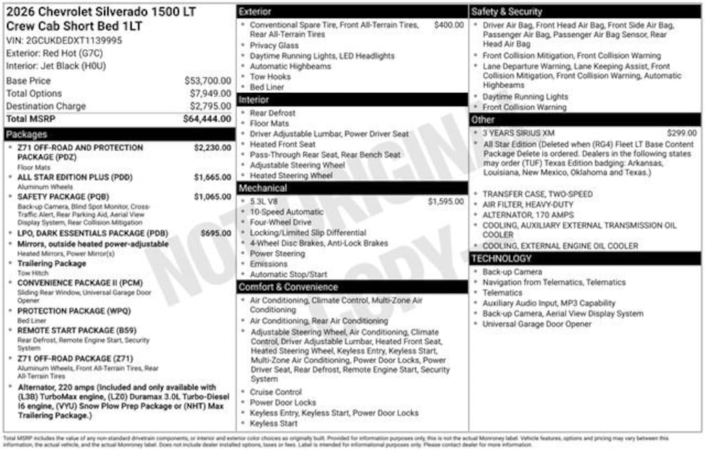 Recent Arrival! Factory MSRP: $62,894*** WE DELIVER ***Red 2026 Chevrolet Silverado 1500 LT 4D Crew Cab 4WD EcoTec3 5.3L V8 10-Speed Automatic10-Way Power Driver Seat w/Lumbar, 12.3 Multicolor Reconfigurable Digital Display, 120-Volt Bed Mounted Power Outlet, 120-Volt Interior Power Outlet, 220 Amp Alternator, 3 Years SiriusXM, 4-Wheel Disc Brakes, 40/20/40 Front Split-Bench Seat, 6 Speakers, 6-Speaker Audio System, ABS brakes, Air Conditioning, All Star Edition Plus, All-Star Edition, All-Weather Floor Liner (LPO) (AAK), Alloy wheels, AM/FM radio: SiriusXM with 360L, Apple CarPlay/Android Auto, Auto High-beam Headlights, Auto-Locking Rear Differential, Automatic Emergency Braking, Automatic temperature control, Black Name Plates (LPO), Bluetooth® For Phone, Brake assist, Bumpers: chrome, Chevytec Spray-On Black Bedliner, Chrome Mirror Caps, Cloth Seat Trim, Color-Keyed Carpeting Floor Covering, Compass, Convenience Package, Convenience Package II, Dark Essentials Package (LPO), Deep-Tinted Glass, Delay-off headlights, Driver door bin, Driver vanity mirror, Dual Exhaust w/Polished Outlets, Dual front impact airbags, Dual front side impact airbags, Dual Rear USB Ports (Charge Only), Dual-Zone Automatic Climate Control, Electric Rear-Window Defogger, Electronic Cruise Control, Electronic Stability Control, Emergency communication system: OnStar, EZ Lift Power Lock & Release Tailgate, Following Distance Indicator, Forward Collision Alert, Front anti-roll bar, Front Center Armrest w/Storage, Front dual zone A/C, Front Frame-Mounted Black Recovery Hooks, Front Pedestrian Braking, Front reading lights, Front Rubberized Vinyl Floor Mats, Front wheel independent suspension, Fully automatic headlights, HD Rear Vision Camera, HD Surround Vision, Heated door mirrors, Heated Driver & Front Outboard Passenger Seats, Heated front seats, Heated Power-Adjustable Outside Mirrors, Heated Steering Wheel, Heated steering wheel, Heavy-Duty Air Filter, Hill Descent Control, Hitch Guidance, Hitch Guidance w/Hitch View, Illuminated entry, In-Vehicle Trailering System App, Inside Rear-View Mirror w/Tilt, Integrated Trailer Brake Controller, IntelliBeam Automatic High Beam On/Off, Keyless Open & Start, Lane Keep Assist w/Lane Departure Warning, LED Cargo Area Lighting, Low tire pressure warning, Manual Tilt/Telescoping Steering Column, Occupant sensing airbag, Off-Road Suspension, OnStar Services Capable, Outside temperature display, Overhead airbag, Overhead console, Panic alarm, Passenger door bin, Passenger vanity mirror, Perimeter Lighting, Power door mirrors, Power driver seat, Power Front Windows w/Driver Express Up/Down, Power Front Windows w/Passenger Express Down, Power Rear Windows w/Express Down, Power Sliding Rear Window w/Rear Defogger, Power steering, Power windows, Premium audio system: Chevrolet Infotainment 3 Premium, Protection Package, Radio data system, Radio: Chevrolet Infotainment 3 Premium System, Rear 60/40 Folding Bench Seat (Folds Up), Rear Cross Traffic Braking, Rear Pedestrian Alert, Rear reading lights, Rear Rubberized-Vinyl Floor Mats, Rear step bumper, Rear Wheelhouse Liners, Rear window defroster, Remote keyless entry, Remote Start Package, Remote Vehicle Starter System, Safety Package, Security system, SiriusXM w/360L Trial Subscription, Speed control, Speed-sensing steering, Split folding rear seat, Standard Suspension Package, Standard Tailgate, Steering Wheel Audio Controls, Steering wheel mounted audio controls, Tachometer, Teen Driver, Telescoping steering wheel, Theft Deterrent System (Unauthorized Entry), Tilt steering wheel, Tire Pressure Monitoring System, Traction control, Trailer Camera Provisions, Trailer Side Blind Zone Alert, Trailering Package, Trip computer, Ultrasonic Front & Rear Park Assist, Universal Home Remote, Variably intermittent Rebates listed are for zip code 48623. Must qualify for GMS Employee purchase plan$1500 - Bonus Cash. Exp. 02/02/2026 $3250 - Customer Cash.