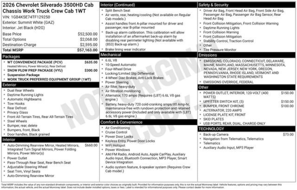170 Amp Alternator, 2-Speed Electronic Shift Transfer Case, 220 Amp Alternator, 3.5 Diagonal Monochromatic Display DIC, 3.73 Rear Axle Ratio, 4-Wheel Disc Brakes, 6-Speaker Audio System Feature, ABS brakes, Air Conditioning, AM/FM radio, Auto High-beam Headlights, Black Front Bumper, Black Mirror Caps, Bluetooth® For Phone, Brake assist, Compass, Deep-Tinted Glass, Dual front impact airbags, Dual front side impact airbags, Electric Rear-Window Defogger, Electronic Stability Control, Emergency communication system, Fully automatic headlights, High-Visibility Molded in Black Outside Mirrors, Illuminated entry, Low tire pressure warning, Manual Tilt-Wheel Steering Column, Occupant sensing airbag, Outside temperature display, Overhead airbag, Preferred Equipment Group 1WT, Premium audio system: Chevrolet Infotainment System 3, Radio: Chevrolet Infotainment 3 System, Rubberized-Vinyl Floor Covering, Snow Plow Prep Package, Solar Absorbing Tinted Glass, Steering Wheel Mounted Electronic Cruise Control, Tilt steering wheel, Traction control, Variably intermittent wipers, WT Convenience Package, 120-Volt (400 Watts) Interior Power Outlet, 17 Painted Steel Wheels, 4-Way Manual Driver Seat Adjuster, 4-Way Manual Passenger Seat Adjuster, 6 Speakers, Auto-Dimming Inside Rear-View Mirror, Delay-off headlights, Driver door bin, Dual rear wheels, Front 40/20/40 Split-Bench Seat, Front anti-roll bar, Front Center Armrest w/Storage, Front Chrome Bumper, Front License Plate Kit, Front reading lights, Front wheel independent suspension, Manual Tilt Inside Rearview Mirror, OnStar Services Capable, Overhead console, Panic alarm, Passenger door bin, Passenger vanity mirror, Perimeter Lighting, Power steering, Power windows, Power-Adjustable Outside Mirrors, Rear reading lights, Remote keyless entry, Speed control, Split folding rear seat, Suspension Package, Tachometer, Trip computer, Upfitter Switch Kit (5), Vinyl Seat Trim, Voltmeter, 170 Amp Alternator, 2-Speed Electronic Shift Transfer Case, 220 Amp Alternator, 3.5 Diagonal Monochromatic Display DIC, 3.73 Rear Axle Ratio, 4-Wheel Disc Brakes, 6-Speaker Audio System Feature, ABS brakes, Air Conditioning, AM/FM radio, Auto High-beam Headlights, Black Front Bumper, Black Mirror Caps, Bluetooth® For Phone, Brake assist, Compass, Deep-Tinted Glass, Dual front impact airbags, Dual front side impact airbags, Electric Rear-Window Defogger, Electronic Stability Control, Emergency communication system, Fully automatic headlights, High-Visibility Molded in Black Outside Mirrors, Illuminated entry, Low tire pressure warning, Manual Tilt-Wheel Steering Column, Occupant sensing airbag, Outside temperature display, Overhead airbag, Preferred Equipment Group 1WT, Premium audio system: Chevrolet Infotainment System 3, Radio: Chevrolet Infotainment 3 System, Rubberized-Vinyl Floor Covering, Snow Plow Prep Package, Solar Absorbing Tinted Glass, Steering Wheel Mounted Electronic Cruise Control, Tilt steering wheel, Traction control, Variably intermittent wipers, WT Convenience Package. Rebates listed are for zip code 48623. Must qualify for GMS Employee purchase plan$1000 - Customer Cash. Exp. 03/02/2026
