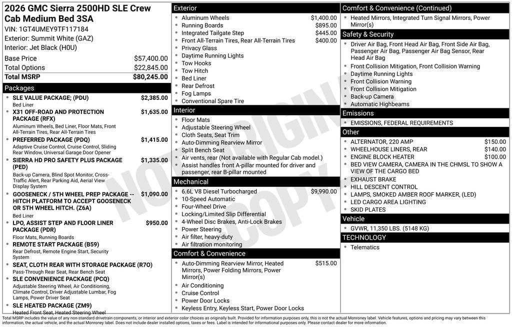 125 point inspection, Sierra 2500HD SLE, Duramax 6.6L V8 Turbodiesel, 10-Speed Automatic, 4WD, 120-Volt Bed Mounted Power Outlet, 120-Volt Instrument Panel Power Outlet, 2 Charge-Only Rear USB Ports, 2 Charge/Data USB Ports, 2-Speed Electronic Shift Transfer Case, 4-Way Manual Driver Seat Adjuster, Adaptive Cruise Control, All-Weather Floor Liners (LPO), Assist Step & Floor Liner Package (LPO), Bed View Camera w/2 Trailer Camera Provisions, Chrome Surround Grille w/Chrome Insert Bars, Cloth Rear Seat w/Storage Package, Deep-Tinted Glass, Electric Rear-Window Defogger, Gooseneck/5th Wheel Prep Package, HD Rear Vision Camera Delete, HD Surround Vision, Hitch Guidance w/Hitch View, In-Vehicle Trailering System App, Keyless Open & Start, LED Cargo Area Lighting, OnStar Services Capable, Power Sliding Rear Window w/Defogger, Preferred Equipment Group 3SA, Preferred Package, Push Button Start, Rear Cross Traffic Alert, Remote Start Package, Remote Vehicle Starter System, Sierra HD Pro Safety Plus Package, SiriusXM w/360L Trial Subscription, Spray-On Pickup Bedliner w/GMC Logo, Steering Wheel Audio Controls, Trailer Cam Provisions & Trailer Viewing Software, Trailer Side Blind Zone Alert, Ultrasonic Front & Rear Park Assist, Unauthorized Entry Theft-Deterrent System, Universal Home Remote, Wireless Phone Projection, 10-Way Power Driver Seat Adjuster w/Lumbar, 17 Machined Aluminum Wheels, 18 Machined Aluminum Wheels, 220-Amp Alternator, 4-Way Manual Passenger Seat Adjuster, 4-Wheel Disc Brakes, 6 Speakers, 6-Speaker Audio System Feature, 6 Rectangular Chromed Tubular Assist Steps (LPO), A/C w/Dual-Zone Automatic Climate Control, ABS brakes, Air Conditioning, Alloy wheels, AM/FM radio: SiriusXM with 360L, Apple CarPlay/Android Auto, Auto High-beam Headlights, Auto-Dimming Inside Rear-View Mirror, Automatic Emergency Braking, Brake assist, Buckle to Drive, Bumpers: chrome, Cloth Seat Trim, Compass, Delay-off headlights, Driver door bin, Driver vanity mirror, Dual front impact airbags, Dual front side impact airbags, Electronic Stability Control, Emergency communication system: OnStar, Engine Block Heater, Exhaust Brake, Following Distance Indicator, Forward Collision Alert, Front 40/20/40 Split-Bench Seats, Front anti-roll bar, Front Center Armrest w/Storage, Front Pedestrian Braking, Front reading lights, Front wheel independent suspension, Fully automatic headlights, GMC MultiPro Tailgate, Heated door mirrors, Heated Driver & Front Outboard Passenger Seats, Heated Steering Wheel, Heavy-Duty 80 Amp Battery, Hill Descent Control, Illuminated entry, IntelliBeam Automatic High Beam On/Off, Lane Departure Warning System, LED Fog Lamps, LED Smoked Amber Roof Marker Lamps, Low tire pressure warning, Manual Tilt-Wheel/Telescoping Steering Column, Occupant sensing airbag, Off-Road Suspension, Outside temperature display, Overhead airbag, Overhead console, Panic alarm, Passenger door bin, Passenger vanity mirror, Perimeter Lighting, Pickup Box, Power door mirrors, Power steering, Power windows, Power-Adjustable Black Outside Mirrors, Radio: AM/FM w/Premium GMC Infotainment System, Rear reading lights, Rear step bumper, Rear Wheelhouse Liners, Remote keyless entry, SLE Convenience Package, SLE Heated Package, SLE Value Package, Speed control, Split folding rear seat, Steering wheel mounted audio controls, Suspension Package, Tachometer, Tilt steering wheel, Traction control, Trip computer, Turn signal indicator mirrors, Variably intermittent wipers, Voltmeter, Wheels: 20 Bright Face w/Dark Painted Pockets, Winter Grille Cover, X31 Off-Road & Protection Package, X31 Off-Road Package, Sierra 2500HD SLE, Duramax 6.6L V8 Turbodiesel, 10-Speed Automatic, 4WD, 120-Volt Bed Mounted Power Outlet, 1 Price includ