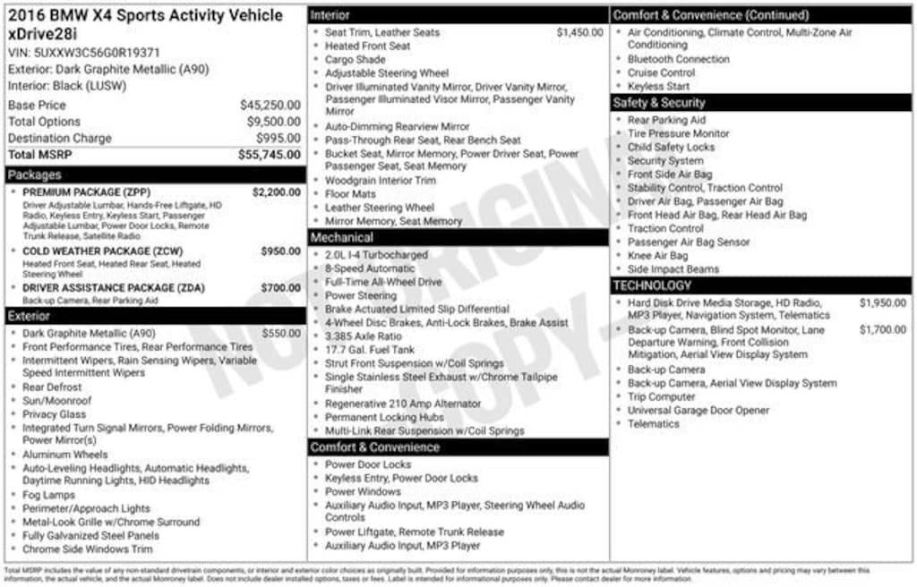 Recent Arrival!*** WE DELIVER ***Dark Graphite 2016 BMW X4 xDrive28i 4D Sport Utility 2.0L I4 TwinPower Turbo 8-Speed Automatic Sport AWD**Rear Backup Camera**, **Heated Seats**, 1st oil change free with purchase, All weather floor matts, Heated Seats, Stolen vehicle location/ Recovery system, Driver monitoring system, Vehicle Usage Alerts, In-vehicle virtual assistant, Vehicle usage alerts, 3.385 Axle Ratio, 4-Wheel Disc Brakes, 9 Speakers, ABS brakes, Active Blind Spot Detection, Active Driving Assistant, Adaptive Full LED Headlights, Advanced Real-Time Traffic Information, Air Conditioning, Alloy wheels, AM/FM radio, Anti-Theft AM/FM Stereo CD/MP3 Player, Anti-whiplash front head restraints, Auto-dimming door mirrors, Auto-dimming Rear-View mirror, Automatic High Beams, Automatic temperature control, BMW Online & BMW Apps, Bodyside moldings, Brake assist, Bumpers: body-color, CD player, Cold Weather Package, Comfort Access Keyless Entry, Delay-off headlights, Driver Assistance Package, Driver Assistance Plus, Driver door bin, Driver vanity mirror, Dual front impact airbags, Dual front side impact airbags, Electronic Stability Control, Emergency communication system, Enhanced USB & Bluetooth, Four wheel independent suspension, Front anti-roll bar, Front Bucket Seats, Front Center Armrest, Front dual zone A/C, Front reading lights, Fully automatic headlights, Garage door transmitter, Genuine wood console insert, HD Radio, Head-Up Display, Heated Front Seats, Heated Rear Seats, Hi-Fi Sound System, High intensity discharge headlights: Bi-xenon, Illuminated entry, Instrument Cluster w/Extended Contents, Leather steering wheel, Lighting Package, Low tire pressure warning, Lumbar Support, M Steering Wheel, Memory seat, MP3 decoder, Navigation System, Nevada Leather Upholstery, Occupant sensing airbag, Outside temperature display, Overhead airbag, Panic alarm, Park Distance Control, Passenger door bin, Passenger vanity mirror, Power door mirrors, Power driver seat, Power Front Bucket Seats, Power Liftgate, Power moonroof, Power passenger seat, Power steering, Power windows, Premium Package, Radio data system, Rain sensing wipers, Rear anti-roll bar, Rear fog lights, Rear Parking Sensors, Rear reading lights, Rear seat center armrest, Rear window defroster, Rear-View Camera, Remote keyless entry, Remote Services, Retractable Headlight Washers, Satellite Radio, Security system, SensaTec Leatherette Upholstery, Speed control, Speed Limit Info, Speed-sensing steering, Speed-Sensitive Wipers, Split folding rear seat, Sport steering wheel, Steering wheel mounted audio controls, Surround View, Tachometer, Technology Package, Telescoping steering wheel, Tilt steering wheel, Traction control, Trip computer, Turn signal indicator mirrors, Variably intermittent wipers, Wheels: 18 x 8.0 Double Spoke (Style 605), 2 Key Fobs, 3.385 Axle Ratio, 4-Wheel Disc Brakes, 9 Speakers, ABS brakes, Active Blind Spot Detection, Active Driving Assistant, Adaptive Full LED Headlights, Advanced Real-Time Traffic Information, Air Conditioning, Alloy wheels, AM/FM radio, Anti-Theft AM/FM Stereo CD/MP3 Player, Anti-whiplash front head restraints, Auto-dimming door mirrors, Auto-dimming Rear-View mirror, Automatic High Beams, Automatic temperature control, BMW Online & BMW Apps, Bodyside moldings, Brake assist, Bumpers: body-color, CD player, Cold Weather Package, Comfort Access Keyless Entry, Delay-off headlights, Driver Assistance Package, Driver Assistance Plus, Driver door bin, Driver vanity mirror, Dual front impact airbags, Dual front side impact airbags, Electronic Stability Control, Emergency communication system, Enhanced USB & Bluetooth, Four wheel independent suspension, Front anti-roll bar, Front Bucket Seats, Front Center Armrest, Front dual zone A/C, Front reading lights, Fully automatic headlights, Garage door transmitter, Genuine wood console insert, HD Radio, Head-Up Display, Heated Front Seats, Heated Rear Seats, Hi-