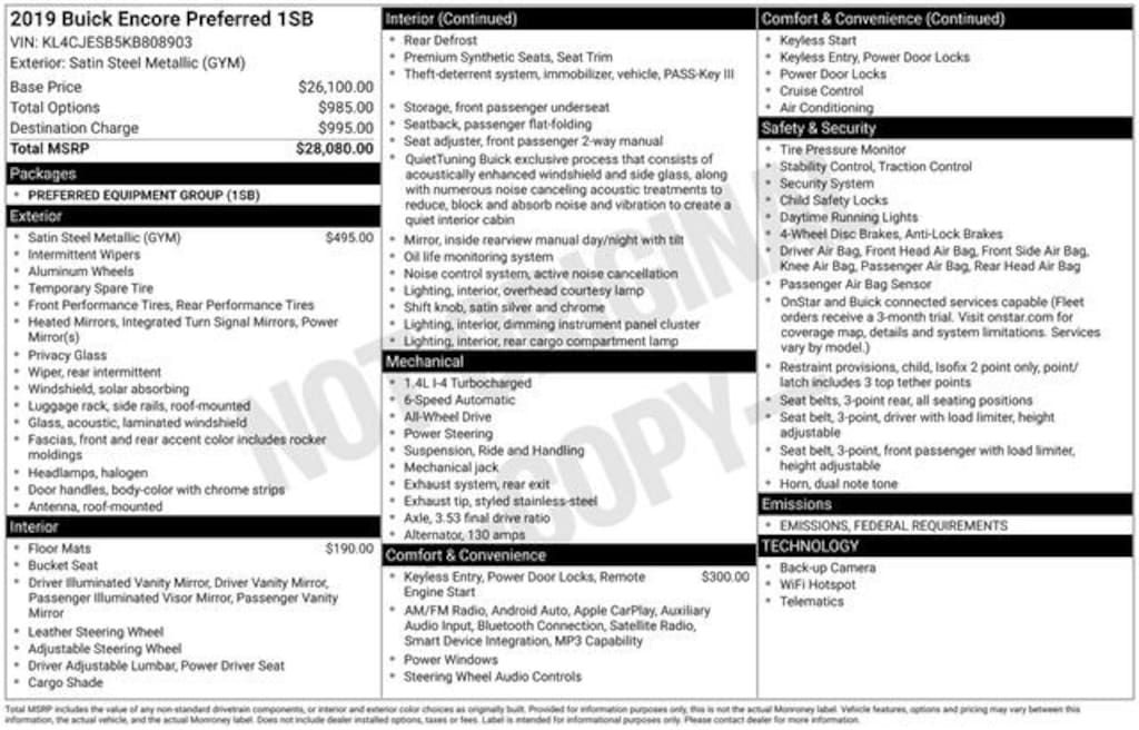 Clean CARFAX.*** WE DELIVER ***Satin Steel Gray Metallic 2019 Buick Encore Preferred 4D Sport Utility ECOTEC 1.4L I4 SMPI DOHC Turbocharged VVT 6-Speed Automatic Electronic with Overdrive AWD2-Way Manual Front Passenger Seat Adjuster, 3.53 Final Drive Axle Ratio, 4-Wheel Disc Brakes, 6 Speakers, 6-Speaker Audio System, 6-Way Power Driver Seat Adjuster, ABS brakes, Air Conditioning, Alloy wheels, AM/FM radio: SiriusXM, Apple CarPlay/Android Auto, Brake assist, Bumpers: body-color, Cloth w/Leatherette Seat Trim, Compass, Delay-off headlights, Driver door bin, Driver vanity mirror, Driver's Seat Mounted Armrest, Dual front impact airbags, Dual front side impact airbags, Electronic Stability Control, Emergency communication system: OnStar and Buick connected services capable, Exterior Parking Camera Rear, Front anti-roll bar, Front Bucket Seats, Front reading lights, Front wheel independent suspension, Fully automatic headlights, Heated door mirrors, Illuminated entry, Knee airbag, Low tire pressure warning, Occupant sensing airbag, Outside temperature display, Overhead airbag, Panic alarm, Passenger door bin, Passenger vanity mirror, Power door mirrors, Power driver seat, Power steering, Power windows, Preferred Equipment Group 1SB, Premium All-Weather Floor Liners (LPO), Radio data system, Radio: Buick Infotainment System AM/FM Stereo, Rear seat center armrest, Rear side impact airbag, Rear window defroster, Rear window wiper, Remote keyless entry, Remote Vehicle Starter System, Ride & Handling Suspension, Roof rack: rails only, Security system, SiriusXM Radio, Speed control, Speed-sensing steering, Split folding rear seat, Spoiler, Steering wheel mounted audio controls, Tachometer, Telescoping steering wheel, Tilt steering wheel, Traction control, Trip computer, Turn signal indicator mirrors, Variably intermittent wipers, Wheels: 18 Machined-Face Alloy.