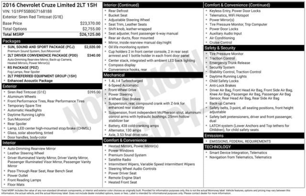 Recent Arrival! CARFAX One-Owner.*** WE DELIVER ***Siren Red Tintcoat 2016 Chevrolet Cruze Limited 2LT ECOTEC 1.4L I4 SMPI DOHC Turbocharged VVT 6-Speed Automatic Electronic with Overdrive FWD 4D SedanLocal Trade, Non Smoker, One Owner, 172 point inspection certified, 1st oil change free with purchase, 2 Key Fobs, 17 5-Spoke Flangeless Alloy Wheels, 2LT Driver Convenience Package, 4-Wheel Disc Brakes, 6 Speaker Audio System Feature, 6 Speakers, ABS brakes, Air Conditioning, Alloy wheels, AM/FM radio: SiriusXM, Auto-Dimming Inside Rear-View Mirror, Brake assist, Bumpers: body-color, CD player, Compass, Delay-off headlights, Driver 6-Way Power Seat Adjuster, Driver door bin, Driver vanity mirror, Dual front impact airbags, Dual front side impact airbags, Electronic Stability Control, Emergency communication system: OnStar, Front anti-roll bar, Front Bucket Seats, Front Center Armrest, Front Passenger 6-Way Manual Seat Adjuster, Front Projector Type Fog Lamps, Front reading lights, Front wheel independent suspension, Fully automatic headlights, Heated Driver & Front Passenger Seats, Heated front seats, Illuminated entry, Knee airbag, Leather Shift Knob, Low tire pressure warning, Meridian Leather-Appointed Seat Trim, Occupant sensing airbag, Outside Heated Power-Adjustable Body-Color Mirrors, Outside temperature display, Overhead airbag, Panic alarm, Passenger door bin, Passenger vanity mirror, Pioneer Premium 9-Speaker System, Power door mirrors, Power driver seat, Power Sliding Sunroof, Power steering, Power windows, Preferred Equipment Group 1SH, Radio data system, Radio: Chevrolet MyLink AM/FM Stereo w/CD Player, Rear seat center armrest, Rear side impact airbag, Rear Spoiler, Rear Vision Camera, Rear window defroster, Remote keyless entry, Rocker Moldings, RS Package, Security system, SiriusXM Satellite Radio, Speed control, Speed-sensing steering, Split folding rear seat, Steering wheel mounted audio controls, Sun, Sound & Sport Package, Tachometer, Telescoping steering wheel, Tilt steering wheel, Traction control, Trip computer, Variably intermittent wipers, Voltmeter, 17 5-Spoke Flangeless Alloy Wheels, 2LT Driver Convenience Package, 4-Wheel Disc Brakes, 6 Speaker Audio System Feature, 6 Speakers, ABS brakes, Air Conditioning, Alloy wheels, AM/FM radio: SiriusXM, Auto-Dimming Inside Rear-View Mirror, Brake assist, Bumpers: body-color, CD player, Compass, Delay-off headlights, Driver 6-Way Power Seat Adjuster, Driver door bin, Driver vanity mirror, Dual front impact airbags, Dual front side impact airbags, Electronic Stability Control, Emergency communication system: OnStar, Front anti-roll bar, Front Bucket Seats, Front Center Armrest, Front Passenger 6-Way Manual Seat Adjuster, Front Projector Type Fog Lamps, Front reading lights, Front wheel independent suspension, Fully automatic headlights, Heated Driver & Front Passenger Seats, Heated front seats, Illuminated entry, Knee airbag, Leather Shift Knob, Low tire pressure warning, Meridian Leather-Appointed Seat Trim, Occupant sensing airbag, Outside Heated Power-Adjustable Body-Color Mirrors, Outside temperature display, Overhead airbag, Panic alarm, Passenger door bin, Passenger vanity mirror, Pioneer Premium 9-Speaker System, Power door mirrors, Power driver seat, Power Sliding Sunroof, Power steering, Power windows, Preferred Equipment Group 1SH, Radio data system, Radio: Chevrolet MyLink AM/FM Stereo w/CD Player, Rear seat center armrest, Rear side impact airbag, Rear Spoiler, Rear Vision Camera, Rear window defroster, Remote keyless entry, Rocker Moldings, RS Package, Security system, SiriusXM Satellite Radio, Speed control, Speed-sensing steering, Split folding rear seat, Steering wheel mounted audio controls, Sun, Sound & Sport Package, Tachometer, Telescoping steering wheel, Tilt steering wheel, Traction control, Trip computer, Variably intermittent wipers, Voltmeter.