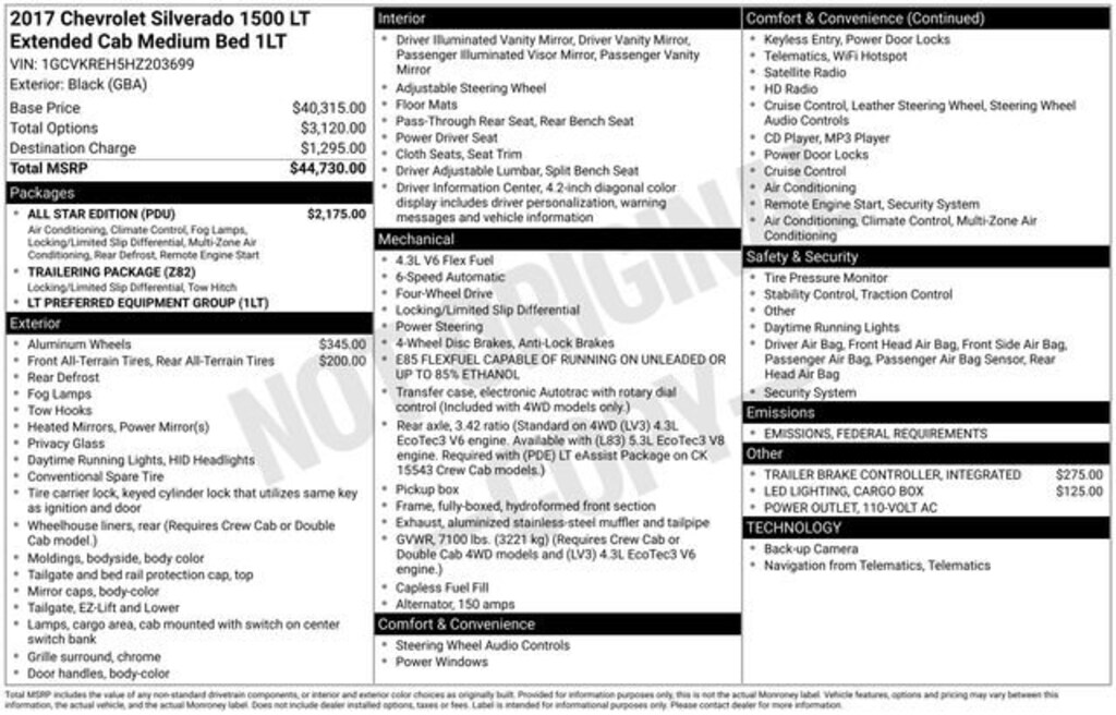 Clean CARFAX.*** WE DELIVER ***Black 2017 Chevrolet Silverado 1500 LT LT1 4D Double Cab EcoTec3 4.3L V6 6-Speed Automatic Electronic with Overdrive 4WD10-Way Power Driver's Seat Adjuster, 110-Volt AC Power Outlet, 150 Amp Alternator, 3.42 Rear Axle Ratio, 4-Wheel Disc Brakes, 4.2 Diagonal Color Display Driver Info Center, 40/20/40 Front Split Bench Seat, 6 Speaker Audio System, 6 Speakers, ABS brakes, Air Conditioning, All Star Edition, Alloy wheels, AM/FM radio: SiriusXM, Bluetooth® For Phone, Body Color Bodyside Moldings, Body-Color Door Handles, Body-Color Mirror Caps, Body-Color Power Adjustable Heated Outside Mirrors, Bodyside moldings, Brake assist, CD player, Cloth Seat Trim, Color-Keyed Carpeting w/Rubberized Vinyl Floor Mats, Compass, Deep-Tinted Glass, Delay-off headlights, Driver & Front Passenger Illuminated Vanity Mirrors, Driver door bin, Driver vanity mirror, Dual front impact airbags, Dual front side impact airbags, Dual-Zone Automatic Climate Control, E85 FlexFuel Capable, Electric Rear-Window Defogger, Electronic Stability Control, Emergency communication system: OnStar Guidance, Exterior Parking Camera Rear, EZ Lift & Lower Tailgate, Front anti-roll bar, Front Center Armrest w/Storage, Front Chrome Bumper, Front reading lights, Front wheel independent suspension, Fully automatic headlights, HD Radio, Heated door mirrors, Heavy-Duty Rear Locking Differential, High-Intensity Discharge Headlights, Illuminated entry, Integrated Trailer Brake Controller, Leather Wrapped Steering Wheel w/Cruise Controls, LED Cargo Box Lighting, Low tire pressure warning, Manual Tilt Wheel Steering Column, Occupant sensing airbag, OnStar 3 Months Guidance Plan, OnStar w/4G LTE, Outside temperature display, Overhead airbag, Overhead console, Panic alarm, Passenger door bin, Passenger vanity mirror, Power door mirrors, Power steering, Power windows, Power Windows w/Driver Express Up, Premium audio system: Chevrolet MyLink, Radio data system, Radio: AM/FM 8 Diagonal Color Touch Screen, Rear 60/40 Folding Bench Seat (Folds Up), Rear Chrome Bumper, Rear reading lights, Rear step bumper, Rear Vision Camera, Rear Wheelhouse Liners, Remote Keyless Entry, Remote keyless entry, Remote Locking Tailgate, Remote Vehicle Starter System, Single Slot CD/MP3 Player, SiriusXM Satellite Radio, Speed control, Speed-sensing steering, Split folding rear seat, Steering Wheel Audio Controls, Steering wheel mounted audio controls, Tachometer, Theft Deterrent System (Unauthorized Entry), Thin Profile LED Fog Lamps, Tilt steering wheel, Traction control, Trailering Package, Trip computer, Variably intermittent wipers, Voltmeter.