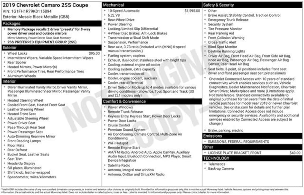 Recent Arrival! Odometer is 18191 miles below market average!*** WE DELIVER ***Mosaic Black Metallic 2019 Chevrolet Camaro SS 2SS 6.2L V8 10-Speed Automatic RWD 2D CoupeLocal Trade, 172 point inspection certified, 1st oil change free with purchase, 2 Key Fobs, 2.77 Rear Axle Ratio, 4-Wheel Disc Brakes, 6-Way Power Front Passenger Seat Adjuster, 8-Way Power Driver Seat Adjuster, 9 Speakers, ABS brakes, Air Conditioning, Alloy wheels, AM/FM radio: SiriusXM, Apple CarPlay/Android Auto, Auto-dimming door mirrors, Automatic temperature control, Bluetooth® For Phone, Bose Premium 9-Speaker Audio System Feature, Brake assist, Bumpers: body-color, Compass, Delay-off headlights, Driver door bin, Driver vanity mirror, Dual front impact airbags, Dual front side impact airbags, Electronic Stability Control, Exterior Parking Camera Rear, Four wheel independent suspension, Front anti-roll bar, Front Bucket Seats, Front Center Armrest, Front dual zone A/C, Front License Plate Bracket, Front reading lights, Front Sport Bucket Seats, Fully automatic headlights, Heads-Up Display, Heated door mirrors, Heated Driver & Front Passenger Seats, Heated front seats, Heated steering wheel, Illuminated entry, Knee airbag, Leather Shift Knob, Leather-Trimmed Seat Trim, Low tire pressure warning, Memory seat, Occupant sensing airbag, Outside temperature display, Overhead airbag, Paddle-Shift Manual Controls, Panic alarm, Passenger door bin, Passenger vanity mirror, Power door mirrors, Power driver seat, Power passenger seat, Power steering, Power windows, Preferred Equipment Group 2SS, Premium audio system: Chevrolet Infotainment System, Radio data system, Radio: Chevrolet Infotainment 3 Plus System, Rear anti-roll bar, Rear window defroster, Remote keyless entry, Remote Vehicle Starter System, Security system, SiriusXM Radio, Speed control, Speed-sensing steering, Spoiler, Steering wheel mounted audio controls, Tachometer, Telescoping steering wheel, Tilt steering wheel, Traction control, Trip computer, Variably intermittent wipers, Ventilated Driver & Front Passenger Seats, Ventilated front seats, Voltmeter, Wheel Locks, Wheels: 20 x 8.5 Fr & 20 x 9.5 Rr 5-Spoke Alum, 2.77 Rear Axle Ratio, 4-Wheel Disc Brakes, 6-Way Power Front Passenger Seat Adjuster, 8-Way Power Driver Seat Adjuster, 9 Speakers, ABS brakes, Air Conditioning, Alloy wheels, AM/FM radio: SiriusXM, Apple CarPlay/Android Auto, Auto-dimming door mirrors, Automatic temperature control, Bluetooth® For Phone, Bose Premium 9-Speaker Audio System Feature, Brake assist, Bumpers: body-color, Compass, Delay-off headlights, Driver door bin, Driver vanity mirror, Dual front impact airbags, Dual front side impact airbags, Electronic Stability Control, Exterior Parking Camera Rear, Four wheel independent suspension, Front anti-roll bar, Front Bucket Seats, Front Center Armrest, Front dual zone A/C, Front License Plate Bracket, Front reading lights, Front Sport Bucket Seats, Fully automatic headlights, Heads-Up Display, Heated door mirrors, Heated Driver & Front Passenger Seats, Heated front seats, Heated steering wheel, Illuminated entry, Knee airbag, Leather Shift Knob, Leather-Trimmed Seat Trim, Low tire pressure warning, Memory seat, Occupant sensing airbag, Outside temperature display, Overhead airbag, Paddle-Shift Manual Controls, Panic alarm, Passenger door bin, Passenger vanity mirror, Power door mirrors, Power driver seat, Power passenger seat, Power steering, Power windows, Preferred Equipment Group 2SS, Premium audio system: Chevrolet Infotainment System, Radio data system, Radio: Chevrolet Infotainment 3 Plus System, Rear anti-roll bar, Rear window defroster, Remote keyless entry, Remote Vehicle Starter System, Security system, SiriusXM Radio, Speed control, Speed-sensing steering, Spoiler, Steering wheel mounted audio controls, Tachometer, Telescoping steering wheel, Tilt steering wheel, Traction control, Trip computer, Variably intermittent wipers, Ventilated D
