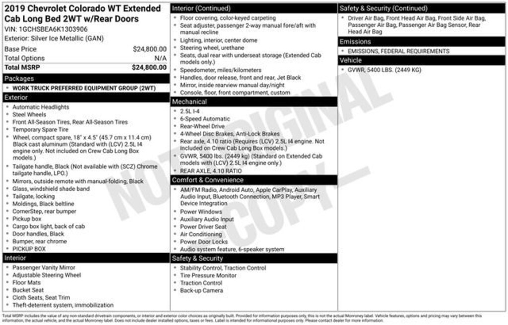Recent Arrival! Clean CARFAX. Odometer is 88477 miles below market average!*** WE DELIVER ***Silver Ice Metallic 2019 Chevrolet Colorado Work Truck 2.5L I4 DI DOHC VVT 6-Speed Automatic RWD4-Wheel Disc Brakes, 4.10 Rear Axle Ratio, 6 Speakers, 6-Speaker Audio System Feature, ABS brakes, Air Conditioning, AM/FM radio, Apple CarPlay/Android Auto, Bumpers: body-color, Cloth Seat Trim, Delay-off headlights, Driver 4-Way Power Seat Adjuster, Driver door bin, Dual front impact airbags, Dual front side impact airbags, Electronic Stability Control, Exterior Parking Camera Rear, Front anti-roll bar, Front Bucket Seats, Front Center Armrest, Front wheel independent suspension, Fully automatic headlights, Low tire pressure warning, Occupant sensing airbag, Overhead airbag, Passenger door bin, Passenger vanity mirror, Power driver seat, Power steering, Power windows, Preferred Equipment Group 2WT, Premium audio system: Chevrolet Infotainment System, Radio data system, Radio: Chevrolet Infotainment 3 System, Rear step bumper, Speed-sensing steering, Split folding rear seat, Tachometer, Tilt steering wheel, Traction control, Trip computer, Variably intermittent wipers, Wheels: 16 x 7 Ultra Silver Metallic Steel.