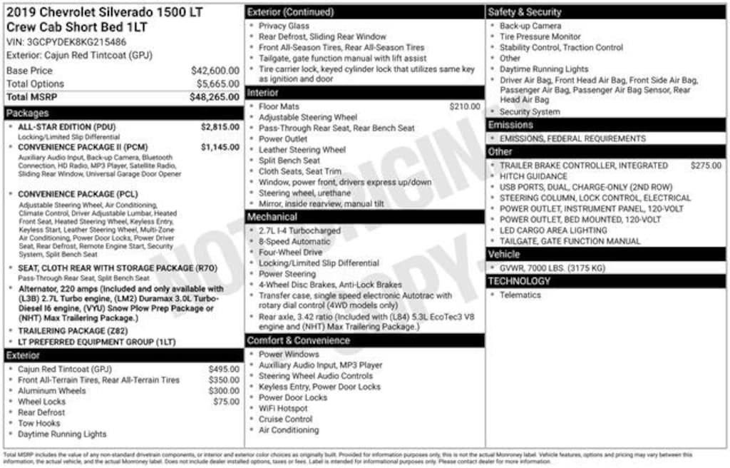 Recent Arrival! Clean CARFAX. Odometer is 39642 miles below market average!*** WE DELIVER ***Cajun Red Tintcoat 2019 Chevrolet Silverado 1500 LT 2.7L Turbo 8-Speed Automatic 4WD 4D Crew CabLocal Trade, Non Smoker, 172 point inspection certified, 1st oil change free with purchase, 2 Key Fobs, 10-Way Power Driver Seat w/Lumbar, 12-Volt Rear Auxiliary Power Outlet, 120-Volt Bed Mounted Power Outlet, 120-Volt Instrument Panel Power Outlet, 2 USB Ports, 2 USB Ports (First Row), 220 Amps Alternator, 3.42 Rear Axle Ratio, 4-Way Manual Driver Seat Adjuster, 4-Wheel Disc Brakes, 4.2 Diagonal Color Display Driver Info Center, 40/20/40 Front Split Bench Seat, 40/20/40 Front Split-Bench Seat, 6 Speakers, ABS brakes, Air Conditioning, All-Star Edition, All-Weather Floor Liner (LPO), Alloy wheels, AM/FM radio, Apple CarPlay/Android Auto, Bluetooth® For Phone, Brake assist, Bumpers: chrome, Chevrolet Connected Access, Chevrolet w/4G LTE, Chrome Grille, Chrome Mirror Caps, Cloth Rear Seat w/Storage Package, Cloth Seat Trim, Color-Keyed Carpeting Floor Covering, Compass, Convenience Package, Convenience Package II, Deep-Tinted Glass, Delay-off headlights, Driver door bin, Driver vanity mirror, Dual front impact airbags, Dual front side impact airbags, Dual-Zone Automatic Climate Control, Electric Rear-Window Defogger, Electrical Lock Control Steering Column, Electronic Cruise Control, Electronic Stability Control, EZ Lift Power Lock & Release Tailgate, Front anti-roll bar, Front Center Armrest w/Storage, Front Frame-Mounted Black Recovery Hooks, Front reading lights, Front Rubberized Vinyl Floor Mats, Front wheel independent suspension, Fully automatic headlights, HD Radio, HD Rear Vision Camera, Heated door mirrors, Heated Driver & Front Passenger Seats, Heated Steering Wheel, Heavy Duty Suspension, Heavy-Duty Rear Locking Differential, Hitch Guidance, Illuminated entry, Integrated Trailer Brake Controller, Keyless Open & Start, Leather Wrapped Steering Wheel, LED Cargo Area Lighting, Locking Tailgate, Low tire pressure warning, Manual Tilt Wheel Steering Column, Manual Tilt/Telescoping Steering Column, Occupant sensing airbag, OnStar & Chevrolet Connected Services Capable, Outside temperature display, Overhead airbag, Overhead console, Panic alarm, Passenger door bin, Passenger vanity mirror, Power Door Locks, Power door mirrors, Power Front Windows w/Driver Express Up/Down, Power Front Windows w/Passenger Express Down, Power Rear Windows w/Express Down, Power Sliding Rear Window w/Rear Defogger, Power steering, Power windows, Preferred Equipment Group 1LT, Premium audio system: Chevrolet Infotainment System 3, Radio data system, Radio: Chevrolet Infotainment 3 Plus System, Radio: Chevrolet Infotainment 3 System, Rear 60/40 Folding Bench Seat (Folds Up), Rear Dual USB Charging-Only Ports, Rear reading lights, Rear Rubberized-Vinyl Floor Mats, Rear step bumper, Rear Vision Camera, Remote Keyless Entry, Remote keyless entry, Remote Vehicle Starter System, Single-Zone Manual/Semi-Automatic Air Conditioning, SiriusXM Radio, Speed control, Speed-sensing steering, Split folding rear seat, Steering Wheel Audio Controls, Steering wheel mounted audio controls, Tachometer, Theft Deterrent System (Unauthorized Entry), Tilt steering wheel, Traction control, Trailering Package, Trip computer, Universal Home Remote, Urethane Steering Wheel, Variably intermittent wipers, Voltmeter, Wheel Locks (Set of 4) (LPO), Wheels: 17 x 8 Bright Silver Painted Aluminum, Wheels: 18 x 8.5 Bright Silver Painted Aluminum, 10-Way Power Driver Seat w/Lumbar, 12-Volt Rear Auxiliary Power Outlet, 120-Volt Bed Mounted Power Outlet, 120-Volt Instrument Panel Power Outlet, 2 USB Ports, 2 USB Ports (First Row), 220 Amps Alternator, 3.42 Rear Axle Ratio, 4-Way Manual Driver Seat Adjuster, 4-Wheel Disc Brakes, 4.2 Diagonal Color Display Driver Info Center, 40/20/40 Front Split Bench Seat, 40/20/40 Front Split-Bench Seat, 6 Speakers, ABS brakes, Air Con