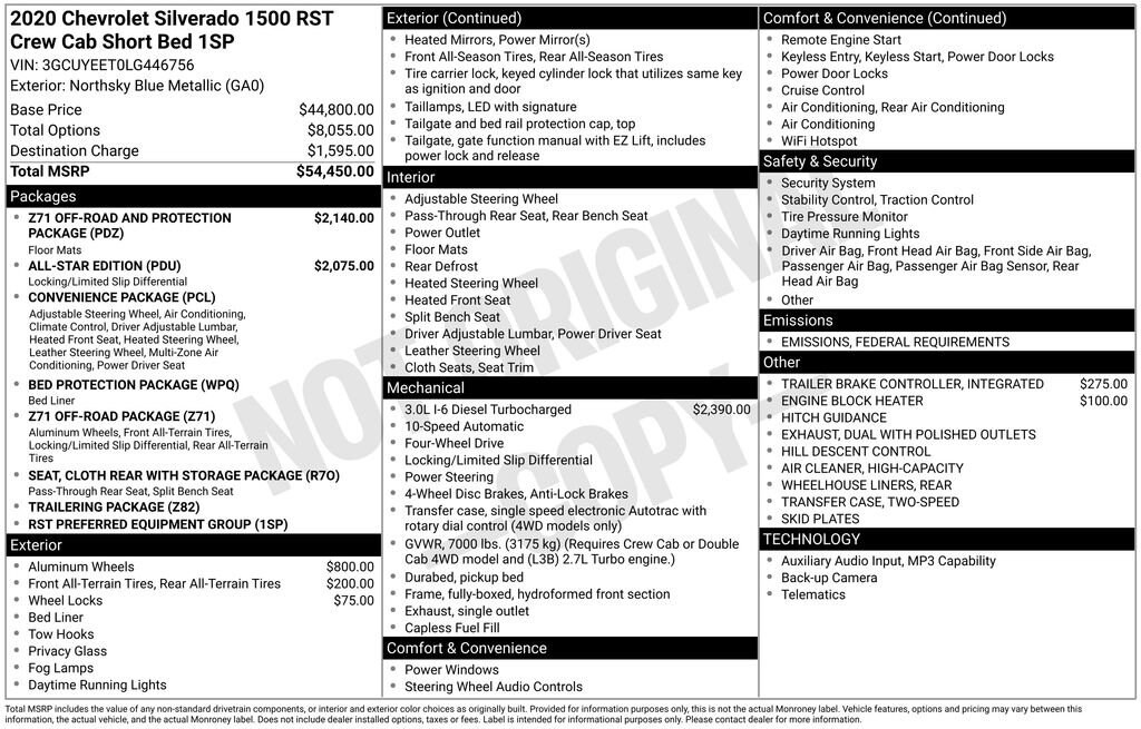 125 point inspection, Silverado 1500 RST, 4D Crew Cab, 3.0L I6, 10-Speed Automatic, 4WD, 10-Way Power Driver Seat w/Lumbar, 12-Volt Rear Auxiliary Power Outlet, 2 USB Ports (First Row), 4-Way Manual Driver Seat Adjuster, 4.2" Diagonal Color Display Driver Info Center, 4G LTE Wi-Fi Hot Spot Capable, 6-Speaker Audio System, All-Star Edition, Bed Protection Package, Bluetooth® For Phone, Body Color Grille, Chevrolet Connected Access Capable, Chevytec Spray-On Black Bedliner, Cloth Rear Seat w/Storage Package, Color-Keyed Carpeting Floor Covering, Compass, Convenience Package, Deep-Tinted Glass, Dual-Zone Automatic Climate Control, Electric Rear-Window Defogger, Electrical Lock Control Steering Column, Engine Block Heater, Front Frame-Mounted Black Recovery Hooks, Front LED Fog Lamps, Front Rubberized Vinyl Floor Mats, Heated Driver & Front Outboard Passenger Seats, Heated Steering Wheel, Heavy-Duty Rear Locking Differential, High Capacity Air Filter, High Gloss Black Mirror Caps, Hitch Guidance, Keyless Open & Start, Leather Wrapped Steering Wheel, LED Cargo Area Lighting, Manual Tilt-Wheel Steering Column, Manual Tilt/Telescoping Steering Column, OnStar & Chevrolet Connected Services Capable, Power Door Locks, Power Front Windows w/Driver Express Up/Down, Power Front Windows w/Passenger Express Down, Power Rear Windows w/Express Down, Preferred Equipment Group 1SP, Rear 60/40 Folding Bench Seat (Folds Up), Rear Dual USB Charging-Only Ports, Rear Rubberized-Vinyl Floor Mats, Rear Vision Camera, Rear Wheelhouse Liners, Remote Vehicle Starter System, Single-Zone Manual/Semi-Automatic Air Conditioning, Steering Wheel Audio Controls, Steering Wheel Mounted Electronic Cruise Control, Theft Deterrent System (Unauthorized Entry), Trailering Package, Urethane Steering Wheel, 220 Amps Alternator, 3.23 Rear Axle Ratio, 4-Wheel Disc Brakes, 40/20/40 Front Split-Bench Seat, 6 Speakers, ABS brakes, Air Conditioning, All-Weather Floor Liner (LPO) (AAK), Alloy wheels, Apple CarPlay/Android Auto, Brake assist, Bumpers: body-color, Cloth Seat Trim, Delay-off headlights, Driver door bin, Driver vanity mirror, Dual Exhaust w/Polished Outlets, Dual front impact airbags, Dual front side impact airbags, Electronic Stability Control, Front anti-roll bar, Front Center Armrest w/Storage, Front fog lights, Front reading lights, Front wheel independent suspension, Fully automatic headlights, Heated door mirrors, Heavy Duty Suspension, Hill Descent Control, Illuminated entry, Integrated Trailer Brake Controller, Low tire pressure warning, Occupant sensing airbag, Off-Road Suspension, Outside temperature display, Overhead airbag, Overhead console, Panic alarm, Passenger door bin, Passenger vanity mirror, Power door mirrors, Power steering, Power windows, Radio data system, Radio: Chevrolet Infotainment 3 System, Rear reading lights, Rear step bumper, Rear window defroster, Remote keyless entry, Security system, Speed control, Speed-sensing steering, Split folding rear seat, Steering wheel mounted audio controls, Tachometer, Tilt steering wheel, Traction control, Trip computer, Variably intermittent wipers, Voltmeter, Wheel Locks (Set of 4) (LPO), Wheels: 18" x 8.5" Bright Silver Painted Aluminum, Wheels: 20" x 9" Painted Aluminum, Z71 Off-Road & Protection Package, Z71 Off-Road Package, Silverado 1500 RST, 4D Crew Cab, 3.0L I6, 10-Speed Automatic, 4WD, 10-Way Power Driver Seat w/Lumbar, 12-Volt Rear Auxiliary Power Outlet, 2 USB Ports (First Row), 4-Way Manual Driver Seat Adjuster, 4.2" Diagonal Color Display Driver Info Center, 4G LTE Wi-Fi Hot Spot Capable, 6-Speaker Audio System, All-Star Edition, Bed Protection Package, Bluetooth® For Phone, Body Color Grille, Chevrolet Connected Access Capab
