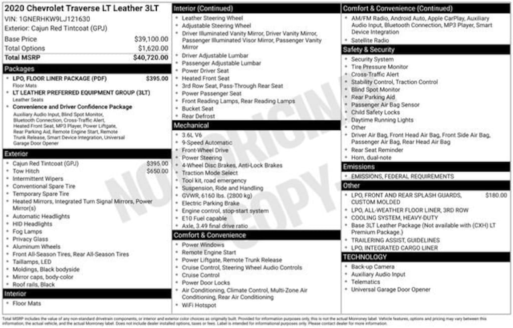 Clean CARFAX. Odometer is 16359 miles below market average!*** WE DELIVER ***Cajun Red Tintcoat 2020 Chevrolet Traverse 3LT 4D Sport Utility 3.6L V6 SIDI VVT 9-Speed Automatic FWD1st & 2nd Row All-Weather Floor Liner (LPO), 3.49 Axle Ratio, 3rd Row All-Weather Floor Liner (LPO), 3rd row seats: split-bench, 4-Wheel Disc Brakes, 6 Speakers, 7-Passenger Seating (2-2-3 Seating Configuration), ABS brakes, Air Conditioning, Alloy wheels, AM/FM radio: SiriusXM, Apple CarPlay/Android Auto, Automatic temperature control, Brake assist, Bumpers: body-color, Compass, Custom Molded Front & Rear Splash Guards (LPO), Delay-off headlights, Driver door bin, Driver vanity mirror, Dual front impact airbags, Dual front side impact airbags, Electronic Stability Control, Emergency communication system: OnStar and Chevrolet connected services capable, Floor Liner Package (LPO), Four wheel independent suspension, Front anti-roll bar, Front Bucket Seats, Front Center Armrest, Front dual zone A/C, Front fog lights, Front reading lights, Fully automatic headlights, Garage door transmitter, Heated door mirrors, Heated front seats, Heavy-Duty Cooling System, High-Intensity Discharge Headlights, Hitch Guidance w/Hitch View, Illuminated entry, Integrated Cargo Liner (LPO), Leather steering wheel, Leather-Appointed Seat Trim, Low tire pressure warning, Occupant sensing airbag, Outside temperature display, Overhead airbag, Overhead console, Panic alarm, Passenger door bin, Passenger vanity mirror, Power door mirrors, Power driver seat, Power Liftgate, Power passenger seat, Power steering, Power windows, Preferred Equipment Group 3LT, Premium audio system: Chevrolet MyLink, Radio data system, Radio: Chevrolet Infotainment 3 Plus System, Rear air conditioning, Rear anti-roll bar, Rear reading lights, Rear window defroster, Rear window wiper, Remote keyless entry, Roof rack: rails only, Security system, SiriusXM w/360L, Speed control, Speed-sensing steering, Spoiler, Steering wheel mounted audio controls, Tachometer, Telescoping steering wheel, Tilt steering wheel, Traction control, Trailering Assist Guidelines, Trailering Equipment, Trip computer, Turn signal indicator mirrors, Variably intermittent wipers, Voltmeter, Wheels: 18 Bright Silver Painted Aluminum.