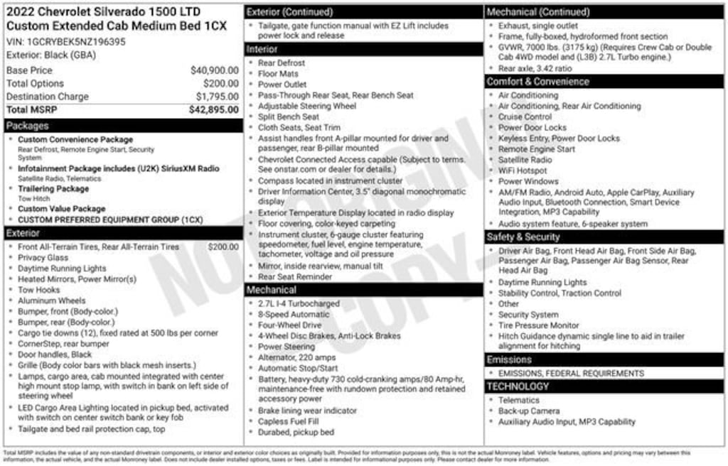 3.42 Rear Axle Ratio, 3.5 Monochromatic Display Driver Info Center, 4-Wheel Disc Brakes, 40/20/40 Front Split Bench Seat, 6 Speakers, 6-Speaker Audio System, ABS brakes, Air Conditioning, Alloy wheels, AM/FM radio: SiriusXM, Apple CarPlay/Android Auto, Bluetooth® For Phone, Body Color Grille, Brake assist, Bumpers: body-color, Chevrolet Connected Access Capable, Cloth Seat Trim, Color-Keyed Carpeting Floor Covering, Compass, Custom Convenience Package, Custom Value Package, Deep-Tinted Glass, Delay-off headlights, Driver door bin, Driver vanity mirror, Dual front impact airbags, Dual front side impact airbags, Electric Rear-Window Defogger, Electronic Cruise Control, Electronic Stability Control, EZ Lift Power Lock & Release Tailgate, Front anti-roll bar, Front Center Armrest w/Storage, Front Frame-Mounted Black Recovery Hooks, Front reading lights, Front Rubberized Vinyl Floor Mats, Front wheel independent suspension, Fully automatic headlights, Heated door mirrors, Heavy Duty Suspension, Hitch Guidance, Illuminated entry, Infotainment Package, LED Cargo Area Lighting, Low tire pressure warning, Manual Tilt Wheel Steering Column, Occupant sensing airbag, OnStar & Chevrolet Connected Services Capable, Outside temperature display, Overhead airbag, Overhead console, Panic alarm, Passenger door bin, Passenger vanity mirror, Power Door Locks, Power door mirrors, Power Front Windows w/Driver Express Up/Down, Power Front Windows w/Passenger Express Down, Power Rear Windows w/Express Down, Power steering, Power windows, Preferred Equipment Group 1CX, Premium audio system: Chevrolet Infotainment 3, Radio data system, Radio: Chevrolet Infotainment 3 System, Rear 60/40 Folding Bench Seat (Folds Up), Rear reading lights, Rear Rubberized-Vinyl Floor Mats, Rear step bumper, Rear window defroster, Remote Keyless Entry, Remote keyless entry, Remote Vehicle Starter System, Security system, SiriusXM Radio, Speed control, Speed-sensing steering, Split folding rear seat, Standard Tailgate, Tachometer, Theft Deterrent System (Unauthorized Entry), Tilt steering wheel, Traction control, Trailering Package, Trip computer, Variably intermittent wipers, Voltmeter, Wheels: 20 x 9 Bright Silver Painted Aluminum, Wi-Fi Hot Spot Capable.