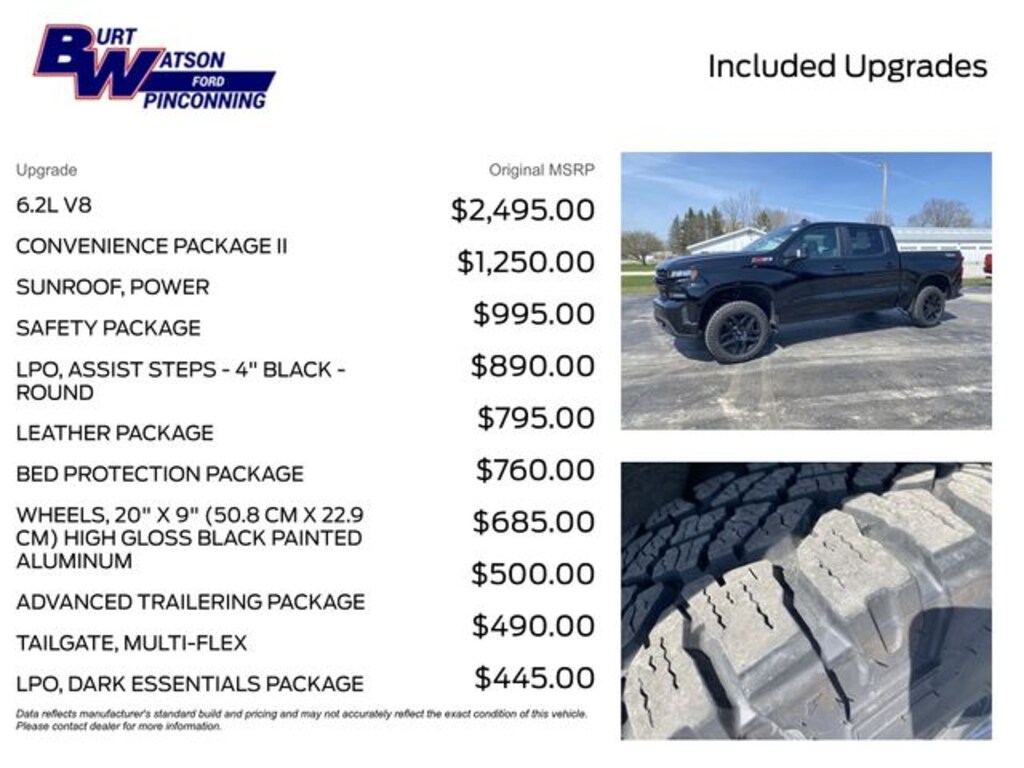 Local Trade, Non Smoker, Leather Seats, 110 point inspection certified, 172 point inspection certified, 1st oil change free with purchase, All weather floor matts, Ceramic coating available on all purchases at discounted pricing, New brakes, New tires, service report available, Cooling Seats, Heated Seats, Digital Key, In-Vehicle Wi-Fi, Stolen vehicle location/ recovery system, 10-Way Power Driver Seat w/Lumbar, 12-Volt Rear Auxiliary Power Outlet, 120-Volt Bed Mounted Power Outlet, 120-Volt Instrument Panel Power Outlet, 2 USB Ports, 2 USB Ports (First Row), 4.2" Diagonal Color Display Driver Info Center, 4" Black Round Assist Steps (LPO), Advanced Trailering Package, Advanced Trailering System, All-Weather Floor Liner (LPO) (AAK), Assist Step & Tonneau Value Package II (LPO), Auto-Dimming Inside Rear-View Mirror, Auto-Locking Rear Differential, Auxiliary External Transmission Oil Cooler, Bed Protection Package, Bed View Camera, Black Dual Exhaust Tips, Black Name Plates (LPO), Bluetooth® For Phone, Chevrolet Connected Access Capable, Chevytec Spray-On Black Bedliner, Cloth Rear Seat w/Storage Package, Color-Keyed Carpeting Floor Covering, Compass, Convenience Package II, Convenience Package w/Buckets Seats, Dark Essentials Package (LPO), Deep-Tinted Glass, Dual Exhaust w/Polished Outlets, Dual-Zone Automatic Climate Control, Electric Rear-Window Defogger, Electronic Cruise Control, EZ Lift Power Lock & Release Tailgate, Floor Mounted Center Console, Front LED Fog Lamps, HD Rear Vision Camera, Heated Driver & Front Outboard Passenger Seats, Heated Steering Wheel, Heavy-Duty Air Filter, High Gloss Black Grille, High Gloss Black Mirror Caps, Hill Descent Control, Hitch Guidance, Hitch Guidance w/Hitch View, Integrated Trailer Brake Controller, Keyless Open & Start, Lane Change Alert w/Side Blind Zone Alert, Leather Package, Leather Wrapped Steering Wheel, Leather-Appointed Front Seat Trim, LED Cargo Area Lighting, LED Reflector Headlamps, LED Reflector High Intensity Headlamps, LT Trail Boss Premium Package, Manual Tilt/Telescoping Steering Column, Midnight Edition, OnStar & Chevrolet Connected Services Capable, Performance Red Recovery Hooks, Perimeter Lighting, Power Door Locks, Power Front Windows w/Driver Express Up/Down, Power Front Windows w/Passenger Express Down, Power Rear Windows w/Express Down, Power Sliding Rear Window w/Rear Defogger, Power Tailgate, Preferred Equipment Group 2LT, Premium Bose 7-Speaker Sound System, Radio: Chevrolet Infotainment 3 Plus System, Rear Cross Traffic Alert, Rear Dual USB Charging-Only Ports, Rear Vision Camera, Rear Wheelhouse Liners, Remote Vehicle Starter System, Safety Package, SiriusXM w/360L, Standard Tailgate, Steering Wheel Audio Controls, Suspension Package, Theft Deterrent System (Unauthorized Entry), Trailering Package, Tri-Fold Soft Tonneau Cover (LPO), Ultrasonic Front & Rear Park Assist, Universal Home Remote, Up-Level Rear Seat w/Storage Package, Wi-Fi Hot Spot Capable, Wireless Phone Projection, 170 Amp Alternator, 3.23 Rear Axle Ratio, 4-Wheel Disc Brakes, 6 Speakers, 6-Speaker Audio System, ABS brakes, Air Conditioning, Alloy wheels, AM/FM radio: SiriusXM, Apple CarPlay/Android Auto, Automatic temperature control, Brake assist, Delay-off headlights, Driver door bin, Driver vanity mirror, Dual front impact airbags, Dual front side impact airbags, Electronic Stability Control, Front anti-roll bar, Front Bucket Seats, Front Center Armrest, Front dual zone A/C, Front fog lights, Front reading lights, Front wheel independent suspension, Fully automatic headlights, Heated door mirrors, Heated front seats, Heated steering wheel, Illuminated entry, Low tire pressure warning, Multi-Flex Tailgate, Not Equipped w/Automatic Stop/Start, Occupant sensing airbag,