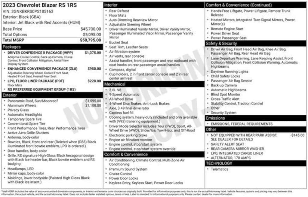 1st & 2nd Row All-Weather Floor Liners (LPO), 3.49 Final Drive Axle Ratio, 4-Wheel Disc Brakes, 6-Way Power Front Passenger Seat Adjuster, 8 Speakers, 8-Way Power Driver Seat Adjuster, ABS brakes, Adaptive Cruise Control, Air Conditioning, Alloy wheels, AM/FM radio: SiriusXM with 360L, Apple CarPlay/Android Auto, Auto High-beam Headlights, Auto-dimming door mirrors, Auto-dimming Rear-View mirror, Automatic temperature control, Bose Premium 8-Speaker Audio System Feature, Brake assist, Bumpers: body-color, Child-Seat-Sensing Airbag, Compass, Delay-off headlights, Driver Confidence II Package, Driver door bin, Driver vanity mirror, Dual front impact airbags, Dual front side impact airbags, Electronic Stability Control, Emergency communication system: OnStar and Chevrolet connected services capable, Enhanced Automatic Emergency Braking, Enhanced Convenience Package, Floor Liner Package (LPO), Four wheel independent suspension, Front anti-roll bar, Front Bucket Seats, Front Center Armrest, Front dual zone A/C, Front reading lights, Fully automatic headlights, Garage door transmitter, HD Surround Vision, Heated door mirrors, Heated Driver & Front Passenger Seats, Heated front seats, Heated Rear Outboard Seating Positions, Heated Steering Wheel, Heated steering wheel, Illuminated entry, Integrated Cargo Liner (LPO), Knee airbag, Leather Shift Knob, Low tire pressure warning, Memory Settings For Driver Seat & Exterior Mirrors, Navigation System, Not Equipped w/Rear Park Assist, Occupant sensing airbag, Outside temperature display, Overhead airbag, Overhead console, Panic alarm, Passenger door bin, Passenger vanity mirror, Perforated Leather-Appointed Seat Trim, Power door mirrors, Power Driver Lumbar Control, Power driver seat, Power Liftgate, Power Panoramic Tilt-Sliding Sunroof, Power passenger seat, Power steering, Power Tilt & Telescoping Steering Column, Power windows, Preferred Equipment Group 1RS, Premium audio system: Chevrolet Infotainment 3 Premium, Radio data system, Radio: Chevrolet Infotainment 3 Premium System, Rear anti-roll bar, Rear Camera Mirror, Rear Camera Mirror Washer, Rear Park Assist w/Audible Warning, Rear reading lights, Rear seat center armrest, Rear window defroster, Rear window wiper, Remote keyless entry, Ride & Handling Suspension, Safety Alert Seat, Security system, SiriusXM w/360L, Speed control, Speed-sensing steering, Split folding rear seat, Spoiler, Steering wheel mounted audio controls, Tachometer, Telescoping steering wheel, Tilt steering wheel, Traction control, Trip computer, Turn signal indicator mirrors, Variably intermittent wipers, Ventilated Driver & Front Passenger Seats, Voltmeter, Wheels: 20 Technical Gray Aluminum, Wheels: 21 High Gloss Black w/Machined Face.