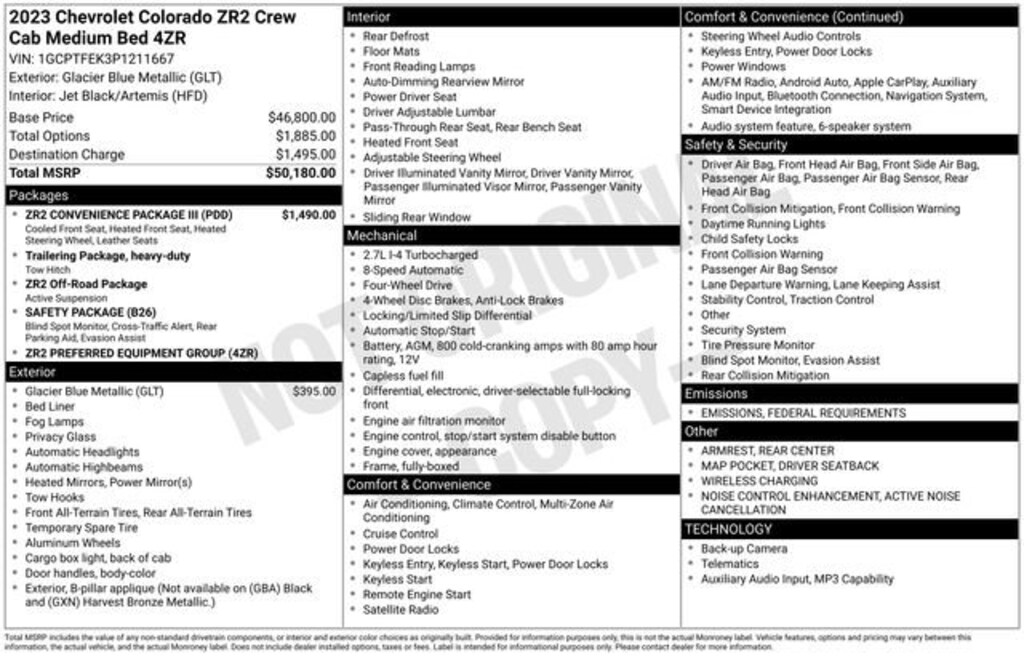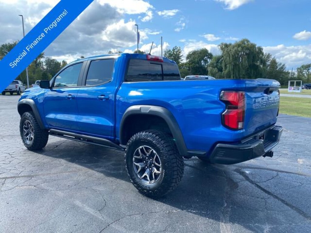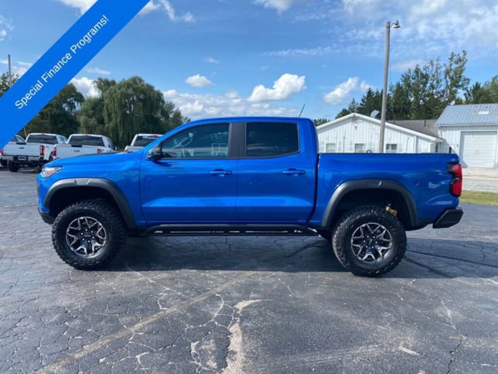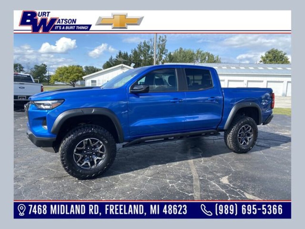 CARFAX One-Owner. Clean CARFAX.*** WE DELIVER ***Glacier Blue Metallic 2023 Chevrolet Colorado ZR2 4D Crew Cab 2.7L Turbo 8-Speed Automatic 4WD3.42 Rear Axle Ratio, 4-Way Manual Passenger Seat Adjuster, 4-Wheel Disc Brakes, 6 Speakers, 6-Speaker Audio System Feature, 8-Way Power Driver Seat Adjuster, ABS brakes, Air Conditioning, Alloy wheels, AM/FM radio: SiriusXM, Apple CarPlay/Android Auto, Auto High-beam Headlights, Auto-dimming Rear-View mirror, Automatic Emergency Braking, Automatic temperature control, Blind Zone Steering Assist, Brake assist, Chevy Safety Assist, Cloth/Evotex Seat Trim, Compass, Delay-off headlights, Driver & Front Passenger Ventilated Seats, Driver door bin, Driver Memory Settings, Driver Seatback Map Pocket, Driver vanity mirror, Dual front impact airbags, Dual front side impact airbags, Electronic Automatic Cruise Control, Electronic Stability Control, Following Distance Indicator, Forward Collision Alert, Front anti-roll bar, Front Bucket Seats, Front Center Armrest, Front dual zone A/C, Front fog lights, Front Pedestrian & Bicyclist Braking, Front reading lights, Front wheel independent suspension, Heated door mirrors, Heated Driver & Front Passenger Seats, Heated front seats, Heated Steering Wheel, Illuminated entry, IntelliBeam Automatic High Beam On/Off, Lane Keep Assist w/Lane Departure Warning, Low tire pressure warning, Navigation System, Occupant sensing airbag, Outside temperature display, Overhead airbag, Overhead console, Panic alarm, Passenger door bin, Passenger Seatback Map Pocket, Passenger vanity mirror, Perforated Leather-Appointed Seat Trim, Power door mirrors, Power Driver Lumbar Control Seat Adjuster, Power driver seat, Power steering, Power windows, Preferred Equipment Group 4ZR, Radio data system, Radio: 11.3 Diagonal Advanced Color LCD Display, Rear Center Armrest, Rear Cross Traffic Braking, Rear Park Assist, Rear reading lights, Rear step bumper, Rear window defroster, Rear-Window Electric Defogger, Remote keyless entry, Safety Package, Security system, SiriusXM Radio, Speed control, Speed-sensing steering, Split folding rear seat, Steering Wheel Mounted Audio Controls, Steering wheel mounted audio controls, Tachometer, Telescoping steering wheel, Tilt steering wheel, Traction control, Trip computer, Variably intermittent wipers, Wheels: 17 x 8 Graphite & Oxide Gold Aluminum, Wireless Charging, Wireless Phone Projection, ZR2 Convenience Package III, ZR2 Off-Road Package.