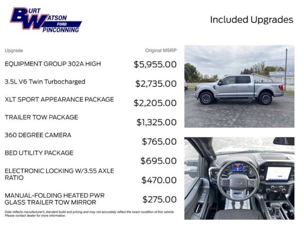 ** Originally Sold and Serviced with Burt Watson Family **, Local Trade, 2 key sets, 172 point inspection certified, 1st oil change free with purchase, 2 Key Fobs, Ceramic coating available on all purchases at discounted pricing, service report available, Heated Seats, Digital Key, In-Vehicle Wi-Fi, Stolen vehicle location/ recovery system, 10-Way Power Driver & Passenger Seats, 2-Bar Style Grille w/Chrome 2 Minor Bars, 360 Degree Camera, 4-Wheel Disc Brakes, 4x4 FX4 Off-Road Bodyside Decal, 6 Speakers, 8" Productivity Screen in Instrument Cluster, ABS brakes, Accent-Color Step Bars, Air Conditioning, Alloy wheels, AM/FM radio, Auto High-beam Headlights, Auto Start-Stop Removal (DISC), Auto-Dimming Rear-View Mirror, Bed Utility Package, Black 2-Bar Style Grille w/Black Surround/Accents, Black 6" Angular Step Bars, Black Exterior Badging, Body-Color Door & Tailgate Handles, Body-Color Front & Rear Bumpers, Box Side Decals, BoxLink, Brake assist, Bright Polished Step Bars, Bumpers: chrome, Chrome Door & Tailgate Handles w/Body-Color Bezel, Chrome Single-Tip Exhaust, Class IV Trailer Hitch Receiver, Cloth 40/20/40 Front Seat, Compass, Connected Built-In Navigation, Dark Interior Appliques, Delay-off headlights, Driver door bin, Driver vanity mirror, Dual front impact airbags, Dual front side impact airbags, Dual Zone Electronic Automatic Temperature Control, Electronic Locking w/3.55 Axle Ratio, Electronic Stability Control, Emergency communication system: SYNC 4 911 Assist, Equipment Group 302A High, Evasive Steering Assist, Extended Range 36 Gallon Fuel Tank, Exterior Parking Camera Rear, Ford Co-Pilot360 Assist 2.0, Front anti-roll bar, Front Center Armrest w/Storage, Front fog lights, Front reading lights, Front wheel independent suspension, Fully automatic headlights, FX4 Off-Road Package, Heated door mirrors, Heated Front Seats, Hill Descent Control, Illuminated entry, Integrated Trailer Brake Controller, Intelligent Access w/Push Button Start, Intelligent Adaptive Cruise Control w/Stop & Go, Intersection Assist, LED Box Lighting, LED Reflector Headlamps, LED Sideview Mirror Spotlights, Low tire pressure warning, Matte Black Tailgate F-150 Decal, Max Trailer Tow Package, Monotube Rear Shocks, Occupant sensing airbag, Off-Road Tuned Front Shock Absorbers, Onboard 400W Outlet, Outside temperature display, Overhead airbag, Overhead console, Panic alarm, Passenger door bin, Passenger vanity mirror, Power door mirrors, Power Glass Heated Sideview Mirrors, Power steering, Power windows, Pro Trailer Backup Assist & Pro Trailer Hitch Assist, Radio data system, Radio: AM/FM SiriusXM w/360L, Radio: AM/FM Stereo w/6 Speakers, Rear reading lights, Rear step bumper, Rear Under-Seat Storage, Rear window defroster, Remote keyless entry, Remote Start System, Remote Start System w/Remote Tailgate Release, Rock Crawl Mode, SecuriCode Drivers Side Keyless-Entry Keypad, Security system, Speed control, Speed Sign Recognition, Speed-sensing steering, Split folding rear seat, Steering wheel mounted audio controls, SYNC 4, SYNC 4 w/Enhanced Voice Recognition, Tachometer, Tailgate Step w/Tailgate Work Surface, Telescoping steering wheel, Tilt steering wheel, Traction control, Trailer Tow Package, Trip computer, Unique Hood & Grille w/Black Accent, Unique Sport Cloth 40/Console/40 Front-Seats, Variably intermittent wipers, Voltmeter, Wheels: 17" Silver Painted Aluminum, Wheels: 18" 6-Spoke Machined Aluminum, Wheels: 18" Chrome-Like PVD, Wheels: 20" Gloss Black Painted Aluminum, Wrapped Steering Wheel, XLT Black Appearance Package, XLT Chrome Appearance Package, XLT Sport Appearance Package, Zone Lighting, 10-Way Power Driver & Passenger Seats, 2-Bar Style Grille w/Chrome 2 Minor Bars, 360 Degree Camera, 4-Wheel Disc Brakes, 4x4 FX4 Off-Road Bodyside Decal, 6 Speakers, 8" Productivity Scr