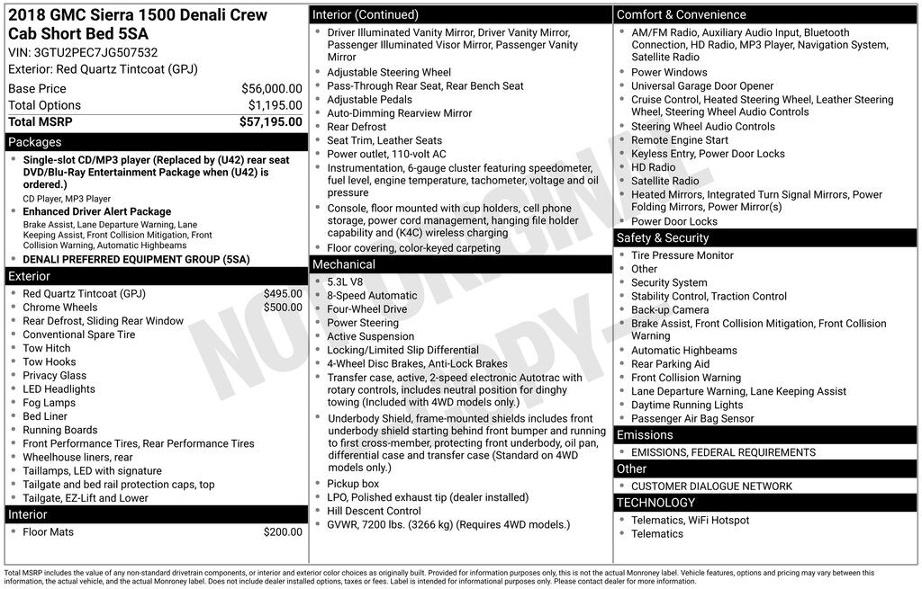 125 point inspection, 110-Volt AC Power Outlet, 150 Amp Alternator, 1st & 2nd Row Color-Keyed Carpeted Floor Mats, 2-Speed Active Electronic AutoTrac Transfer Case, 3.42 Rear Axle Ratio, 4-Wheel Disc Brakes, 6" Rectangular Chromed Tubular Assist Steps, 7 Speakers, 8" Multi-Color Customizable Driver Display, ABS brakes, Adaptive suspension, Adjustable pedals, Air Conditioning, All-Weather Floor Liner (LPO), Alloy wheels, AM/FM radio: SiriusXM, Auto High-beam Headlights, Auto-dimming door mirrors, Auto-Dimming Inside Rear-View Mirror, Auto-dimming Rear-View mirror, Automatic temperature control, Body Color Lower Front Bumper, Body Color Rear Bumper w/Cornersteps, Bodyside moldings, Bose Speaker System, Brake assist, Bumpers: body-color, CD player, Chrome Bodyside Moldings, Chrome Door Handles, Chrome Mirror Caps, Color-Keyed Carpeting, Compass, Deep-Tinted Glass, Delay-off headlights, Driver & Front Passenger Illuminated Vanity Mirrors, Driver door bin, Driver vanity mirror, Dual front impact airbags, Dual front side impact airbags, Dual-Zone Automatic Climate Control, Electric Rear-Window Defogger, Electronic Stability Control, Enhanced Driver Alert Package, Exterior Parking Camera Rear, EZ Lift & Lower Tailgate, Floor Mounted Console, Forward Collision Alert, Front anti-roll bar, Front Center Armrest w/Storage, Front dual zone A/C, Front fog lights, Front Frame-Mounted Black Recovery Hooks, Front Full Feature Power Reclining Bucket Seats, Front reading lights, Front wheel independent suspension, Fully automatic headlights, Garage door transmitter, GMC 4G LTE, GMC Connected Access, HD Radio, Heated & Ventilated Front Bucket Seats, Heated door mirrors, Heated front seats, Heated steering wheel, Illuminated entry, IntelliBeam Automatic High Beam On/Off Headlight, Lane Keep Assist, Leather Wrapped Heated Steering Wheel, Low Speed Forward Automatic Braking, Low tire pressure warning, MagneRide Magnetic Ride Control Suspension, Manual Tilt/Telescoping Steering Column, Memory seat, Navigation System, Occupant sensing airbag, OnStar & GMC Connected Services Capable, Outside temperature display, Overhead airbag, Overhead console, Panic alarm, Passenger door bin, Passenger vanity mirror, Perforated Leather Appointed Seat Trim, Polished Exhaust Tip, Power Adjustable Pedals, Power door mirrors, Power driver seat, Power Folding & Adjustable Heated Outside Mirrors, Power passenger seat, Power Sliding Rear Window w/Defogger, Power steering, Power windows, Power Windows w/Driver Express Up & Down, Preferred Equipment Group 5SA, Premium audio system: GMC Infotainment System, Radio data system, Radio: AM/FM/GMC Infotainment & Navigation, Rear 60/40 Folding Bench Seat (Folds Up), Rear reading lights, Rear seat center armrest, Rear step bumper, Rear Wheelhouse Liners, Rear window defroster, Remote Keyless Entry, Remote keyless entry, Remote Locking Tailgate, Remote Vehicle Starter System, Security system, Single Slot CD/MP3 Player, SiriusXM Satellite Radio, Speed control, Speed-sensing steering, Split folding rear seat, Steering Wheel Audio Controls, Steering wheel mounted audio controls, Tachometer, Telescoping steering wheel, Theft Deterrent System (Unauthorized Entry), Thin Profile LED Fog Lamps, Tilt steering wheel, Traction control, Trailering Equipment, Trip computer, Turn signal indicator mirrors, Ultrasonic Front & Rear Park Assist, Universal Home Remote, Variably intermittent wipers, Ventilated front seats, Voltmeter, Wheels: 20" x 9" Bright Machined Aluminum, Wheels: 20" x 9" Chrome (4), Wireless Charging.