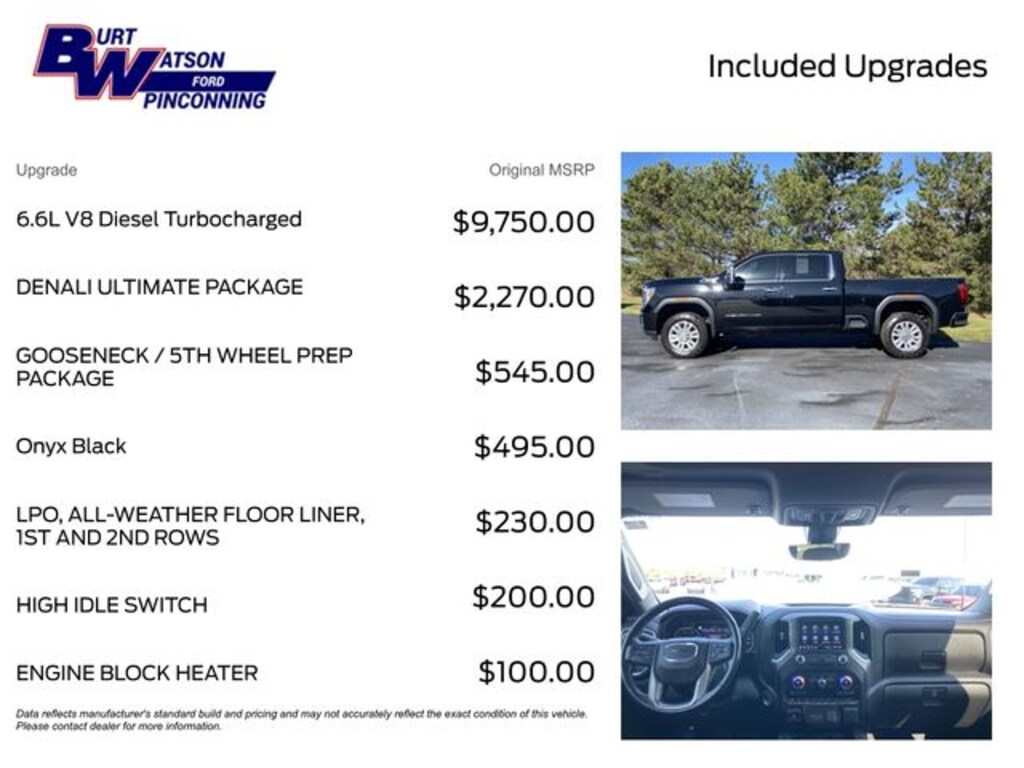 10-Way Power Driver Seat Adjuster w/Lumbar, 10-Way Power Passenger Seat Adjuster w/Lumbar, 12-Volt Rear Auxiliary Power Outlet, 120-Volt Bed Mounted Power Outlet, 120-Volt Instrument Panel Power Outlet, 2 USB Ports (First Row), 2 USB Ports Inside Console, 2-Speed Active Transfer Case, 220 Amp Alternator, 2nd Row Dual USB Charge-Only Ports, 4-Wheel Disc Brakes, 6" Rectangular Chromed Tubular Assist Steps, 7 Speakers, ABS brakes, Air Conditioning, All-Weather Floor Liners (LPO), Alloy wheels, AM/FM radio: SiriusXM with 360L, Apple CarPlay/Android Auto, Auto High-beam Headlights, Auto-dimming door mirrors, Auto-Dimming Inside Rearview Mirror w/Camera, Auto-dimming Rear-View mirror, Automatic Emergency Braking, Automatic temperature control, Bed View Camera w/2 Trailer Camera Provisions, Bose Premium 7 Speaker Sound System, Brake assist, Bumpers: body-color, Compass, Compass Located In Instrument Cluster, Deep-Tinted Glass, Delay-off headlights, Denali Ultimate Package, Driver Alert Package I, Driver Alert Package II, Driver door bin, Driver Memory, Driver vanity mirror, Dual front impact airbags, Dual front side impact airbags, Electric Rear-Window Defogger, Electrical Lock Control Steering Column, Electronic Stability Control, Engine Block Heater, Exhaust Brake, Exterior Parking Camera Rear, Floor-Mounted Center Console, Following Distance Indicator, Forge Perforated Leather-Appointed Seat Trim, Forward Collision Alert, Front anti-roll bar, Front Bucket Seats, Front Center Armrest, Front Chrome Recovery Hooks, Front dual zone A/C, Front fog lights, Front reading lights, Front wheel independent suspension, Fully automatic headlights, Garage door transmitter, Genuine wood console insert, Genuine wood door panel insert, GMC Connected Access Capable, Gooseneck/5th Wheel Prep Package, HD Rear Vision Camera, HD Surround Vision w/2 Trailer View Camera Provisions, Heated door mirrors, Heated Driver & Front Outboard Passenger Seats, Heated front seats, Heated steering wheel, Heavy-Duty 80 Amp Battery, High Idle Switch, Hill Descent Control, Hitch Guidance w/Hitch View, Illuminated entry, In-Vehicle Trailering System App, Integrated Trailer Brake Controller, IntelliBeam Automatic High Beam On/Off, Keyless Open & Start, Lane Change Alert w/Side Blind Zone Alert, Lane Departure Warning System, LED Cargo Area Lighting, Low tire pressure warning, Manual Tilt-Wheel/Telescoping Steering Column, Memory seat, Multicolor 15" Diagonal Head-Up Display, Navigation System, Not Equipped w/Front & Rear Park Assist, Not Equipped w/Heated 2nd Row Outboard Seats, Occupant sensing airbag, Off-Road Suspension, OnStar & GMC Connected Services Capable, Outside temperature display, Overhead airbag, Overhead console, Panic alarm, Passenger door bin, Passenger vanity mirror, Pickup Bed, Polished Exhaust Tip, Power Door Locks, Power door mirrors, Power driver seat, Power Front Passenger Windows w/Express Up/Down, Power Front Windows w/Driver Express Up/Down, Power passenger seat, Power Rear Windows w/Express Down, Power Sliding Rear Window w/Defogger, Power steering, Power Sunroof, Power windows, Preferred Equipment Group 5SA, Premium audio system: Premium GMC Infotainment System, ProGrade Trailering System, Radio: AM/FM w/Prem GMC Infotainment System & Navi, Rear Cross Traffic Alert, Rear reading lights, Rear seat center armrest, Rear step bumper, Rear Wheelhouse Liners, Rear window defroster, Remote keyless entry, Remote Vehicle Starter System, Safety Alert Seat, Security system, Signature Denali Grille w/High Gloss Black Mesh, SiriusXM w/360L, Snow Plow Prep/Camper Package, Speed control, Speed-sensing steering, Split folding rear seat, Spray-On Pickup Bed Liner w/Denali Logo, Steering Wheel Audio Controls, Steering wheel mounted audio controls, Tachometer, Technology Package, Telescopi