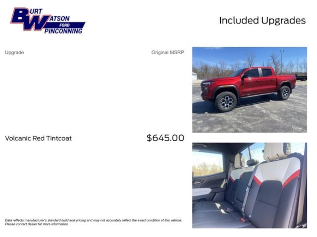 Pricing shown excludes tax, title, license, registration, or other applicable government fees. Any optional products, services, or accessories are also not reflected in the advertised price. At Burt Watson, it is our belief that every customer deserves a buying experience built on clarity and honesty. We're dedicated to doing business the right way, simply and transparently. While we make every effort to ensure the information on our site is accurate and up to date, occasional errors, omissions, or inaccuracies may occur. Additionally, there may be a delay between when a vehicle is sold and when our online inventory is updated. We encourage you to confirm all vehicle details and pricing directly with our team before purchase.