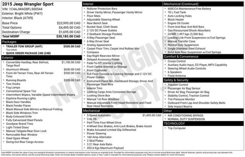 Clean CARFAX.*** WE DELIVER ***Bright White Clearcoat 2015 Jeep Wrangler Sport 2D Sport Utility 3.6L V6 24V VVT 5-Speed Automatic 4WD16 x 7.0 Luxury Styled Steel Wheels, 17 x 7.5 Aluminum Wheels, 3.21 Rear Axle Ratio, 4-Wheel Disc Brakes, 8 Speakers, ABS brakes, AM/FM radio, Black 3-Piece Hard Top, Brake assist, CD player, Class II Receiver Hitch, Cloth Bucket Seats, Compass, Delete Sunrider Soft Top, Driver door bin, Driver vanity mirror, Dual front impact airbags, Electronic Stability Control, Freedom Panel Storage Bag, Front anti-roll bar, Front Bucket Seats, Front Center Armrest w/Storage, Front fog lights, Integrated roll-over protection, Low tire pressure warning, Normal Duty Suspension, Occupant sensing airbag, Outside temperature display, Passenger door bin, Passenger vanity mirror, Power steering, Quick Order Package 24B, Radio: Uconnect 130 AM/FM/CD/MP3, Rear anti-roll bar, Rear Window Defroster, Rear Window Wiper/Washer, Speed control, Steering wheel mounted audio controls, Sunrider Soft Top, Tachometer, Tilt steering wheel, Tinted Rear Quarter & Liftgate Windows, Traction control, Trailer Tow Group, Trailer Tow w/4-Pin Connector Wiring, Trip computer, Tubular Side Steps, Variably intermittent wipers.