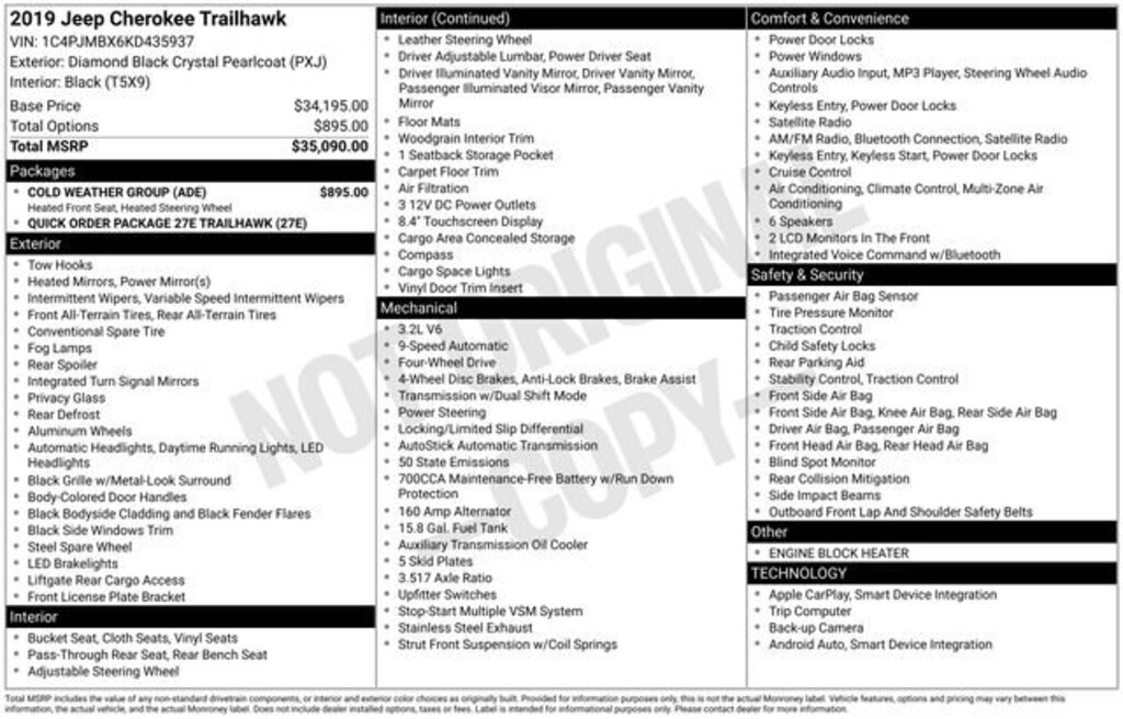 Diamond Black Crystal Pearlcoat 2019 Jeep Cherokee Trailhawk 4D Sport Utility 3.2L V6 9-Speed 948TE Automatic 4WD