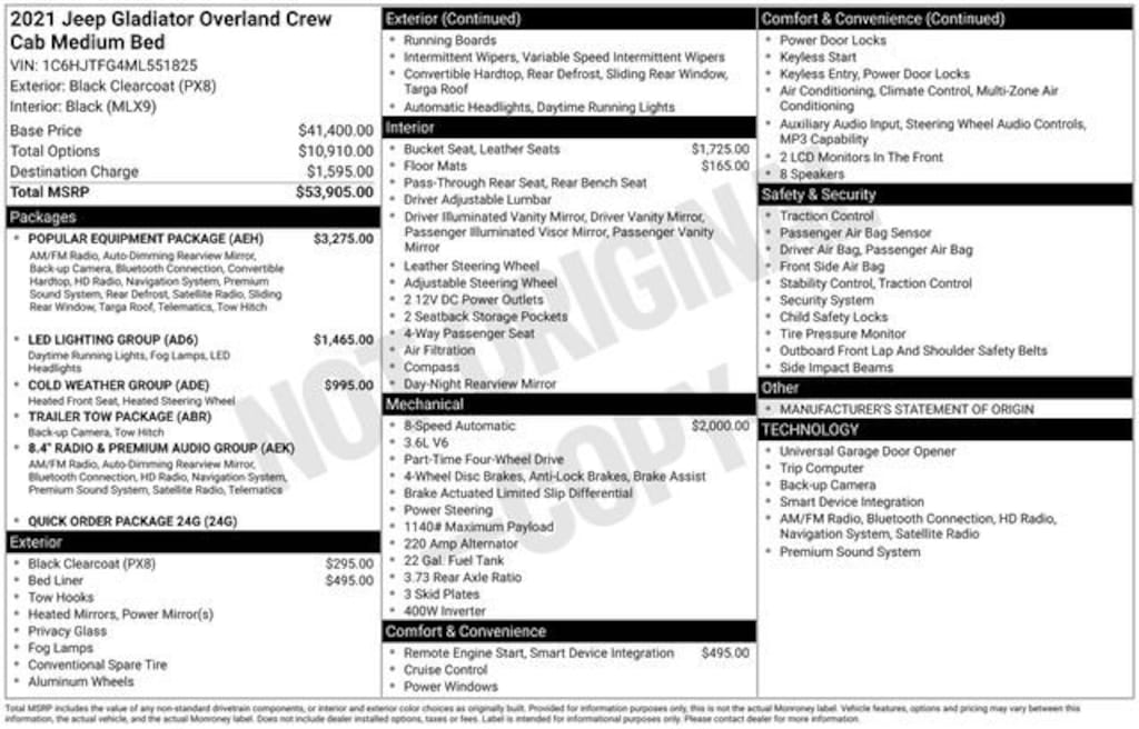 Black Clearcoat 2021 Jeep Gladiator Overland 4D Crew Cab 3.6L V6 24V VVT 8-Speed Automatic 4WD