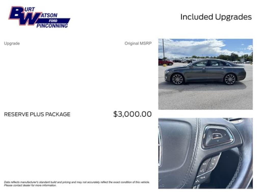 11 Speakers, 4-Wheel Disc Brakes, ABS brakes, Adaptive suspension, Air Conditioning, Alloy wheels, Aluminum Foot Pedal Cover, AM/FM radio: SiriusXM, AppLink/Apple CarPlay and Android Auto, Auto High-beam Headlights, Auto tilt-away steering wheel, Auto-dimming door mirrors, Auto-dimming Rear-View mirror, Automatic temperature control, Brake assist, Bumpers: body-color, Compass, Delay-off headlights, Driver door bin, Driver vanity mirror, Dual front impact airbags, Dual front side impact airbags, Electronic Stability Control, Emergency communication system: SYNC 3 911 Assist, Equipment Group 200A, Exterior Parking Camera Rear, Four wheel independent suspension, Front anti-roll bar, Front Bucket Seats, Front Center Armrest, Front dual zone A/C, Front reading lights, Fully automatic headlights, Garage door transmitter, Genuine wood dashboard insert, Genuine wood door panel insert, Heated door mirrors, Heated front seats, Heated Rear Seats, Heated Steering Wheel, High-Intensity Discharge Headlights, Illuminated entry, Knee airbag, Leather steering wheel, Low tire pressure warning, Memory seat, Navigation System, Occupant sensing airbag, Outside temperature display, Overhead airbag, Overhead console, Painted Upper Grille, Panic alarm, Passenger door bin, Passenger vanity mirror, Power door mirrors, Power driver seat, Power Moonroof, Power passenger seat, Power steering, Power windows, Premium Leather-Trimmed Non-Perf Heated Buckets, Radio data system, Radio: Lincoln Premium Sound System w/MP3 & Nav, Radio: Revel Audio System w/Single CD & HD Radio, Rain sensing wipers, Rear anti-roll bar, Rear Parking Sensors, Rear reading lights, Rear seat center armrest, Rear window defroster, Remote keyless entry, Reserve Plus Package, Security system, Speed control, Speed-sensing steering, Speed-Sensitive Wipers, Split folding rear seat, Steering wheel memory, Steering wheel mounted audio controls, SYNC 3, Tachometer, Telescoping steering wheel, Tilt steering wheel, Traction control, Trip computer, Turn signal indicator mirrors, Variably intermittent wipers, Wheels: 18" Machined 5-Spoke Aluminum, Wheels: 19" Satin Finish 10 Spk Machined Aluminum.