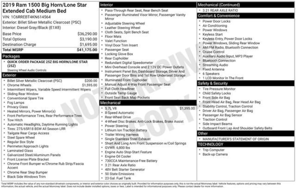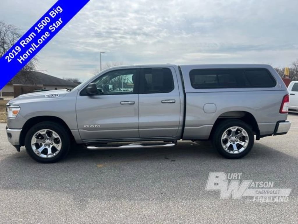 Recent Arrival! Clean CARFAX. Odometer is 40738 miles below market average!*** WE DELIVER ***Billet Silver Metallic Clearcoat 2019 Ram 1500 Big Horn/Lone Star 4D Quad Cab HEMI 5.7L V8 Multi Displacement VVT 8-Speed Automatic RWD3 Rear Seat Head Restraints, 3.21 Rear Axle Ratio, 4 Way Front Headrests, 4-Wheel Disc Brakes, 48V Belt Starter Generator, 6 Speakers, ABS brakes, Air Conditioning, Alloy wheels, AM/FM radio, Brake assist, Bumpers: chrome, Cloth Bench Seat, Compass, Delay-off headlights, Driver door bin, Dual front impact airbags, Dual front side impact airbags, Electronic Stability Control, Front anti-roll bar, Front Center Armrest w/Storage, Front fog lights, Front reading lights, Front Seat Back Map Pockets, Front wheel independent suspension, Fully automatic headlights, GPS Antenna Input, Heated door mirrors, Illuminated entry, Leather steering wheel, Low tire pressure warning, Manual Adjust 4-Way Front Passenger Seat, Manufacturer's Statement of Origin, Occupant sensing airbag, Outside temperature display, Overhead airbag, Overhead console, Panic alarm, ParkView Rear Back-Up Camera, Passenger door bin, Passenger vanity mirror, Power door mirrors, Power steering, Power windows, Quick Order Package 25Z Big Horn/Lone Star, Radio data system, Radio: Uconnect 3 w/5 Display, Rear 60/40 Folding Seat, Rear anti-roll bar, Rear seat center armrest, Rear step bumper, Remote keyless entry, Speed control, Split folding rear seat, Steering Wheel Mounted Audio Controls, Tachometer, Telescoping steering wheel, Tilt steering wheel, Traction control, Trip computer, Variably intermittent wipers, Voltmeter, Wheels: 18 x 8, Wheels: 20 x 9 Aluminum Chrome Clad.