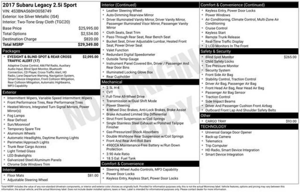 Recent Arrival!*** WE DELIVER ***Ice Silver Metallic 2017 Subaru Legacy 2.5i Sport 2.5L 4-Cylinder DOHC 16V CVT Lineartronic AWD 4D Sedan4-Wheel Disc Brakes, 6 Speakers, ABS brakes, Adaptive Cruise Control, Air Conditioning, All Weather Floor Mats, Alloy wheels, AM/FM radio: SiriusXM, Anti-whiplash front head restraints, Auto-dimming Rear-View mirror, Automatic temperature control, Blind Spot Detection (BSD), Bodyside moldings, Brake assist, Bumpers: body-color, Cargo Tray, CD player, Cloth Upholstery w/Blue Stitching, Compass, Driver door bin, Driver vanity mirror, Dual front impact airbags, Dual front side impact airbags, Electronic Stability Control, Emergency communication system, Exterior Auto Dimming Mirror w/Approach Light/BSD, Exterior Parking Camera Rear, EyeSight & Blind Spot & Rear Cross Traffic Alert, Four wheel independent suspension, Front anti-roll bar, Front Bucket Seats, Front Center Armrest w/Storage, Front dual zone A/C, Front fog lights, Front reading lights, Fully automatic headlights, Garage door transmitter, Heated door mirrors, Heated front seats, Heated Reclining Front Bucket Seats, High Beam Assist, Illuminated entry, Lane Departure Warning System, Leather Shift Knob, Low tire pressure warning, Navigation System, Occupant sensing airbag, Outside temperature display, Overhead airbag, Overhead console, Panic alarm, Passenger door bin, Passenger vanity mirror, Power door mirrors, Power driver seat, Power moonroof, Power steering, Power windows, Pre-Collision System, Radio: Subaru Starlink 7.0 Multimedia Nav System, Radio: Subaru Starlink 7.0 Multimedia Plus System, Rear anti-roll bar, Rear Cross Traffic Alert (RCTA), Rear seat center armrest, Rear window defroster, Remote keyless entry, Reverse Auto Brake, Security system, Smartphone Integration, Speed control, Speed-sensing steering, Split folding rear seat, Steering wheel mounted audio controls, Steering-Wheel Paddle-Shift Control Switches, Tachometer, Telescoping steering wheel, Tilt steering wheel, Traction control, Trip computer, Turn signal indicator mirrors, Variably intermittent wipers, Vehicle Information Display, Wheels: 18 x 7.5 Aluminum Alloy Black.